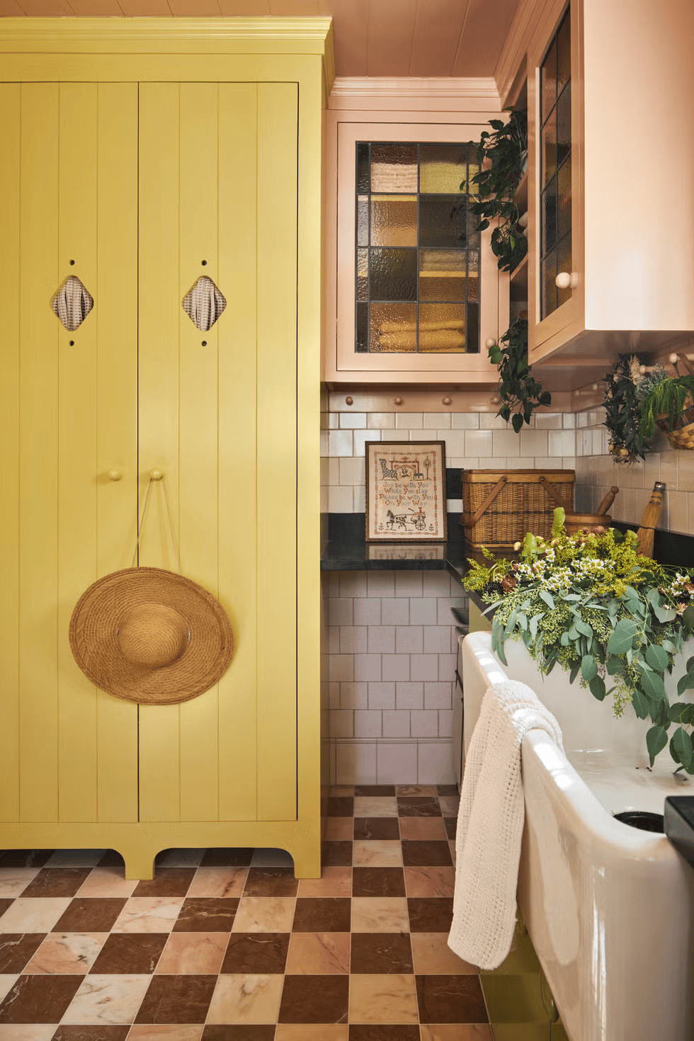 Το πλυσταριό δεν έχει να ζηλέψει τίποτα από τη χρωματική παλέτα των υπόλοιπων δωματίων. Ένας εξίσου λειτουργικός χώρος με αρκετές λύσεις αποθήκευσης για τα είδη καθαριότητας και τα ογκώδη αντικείμενα, όπως το μεγάλο ντουλάπι με χρώμα "Benjamin Moore Damask Yellow" και τα κρυμμένα πτυσσόμενα καλάθια.