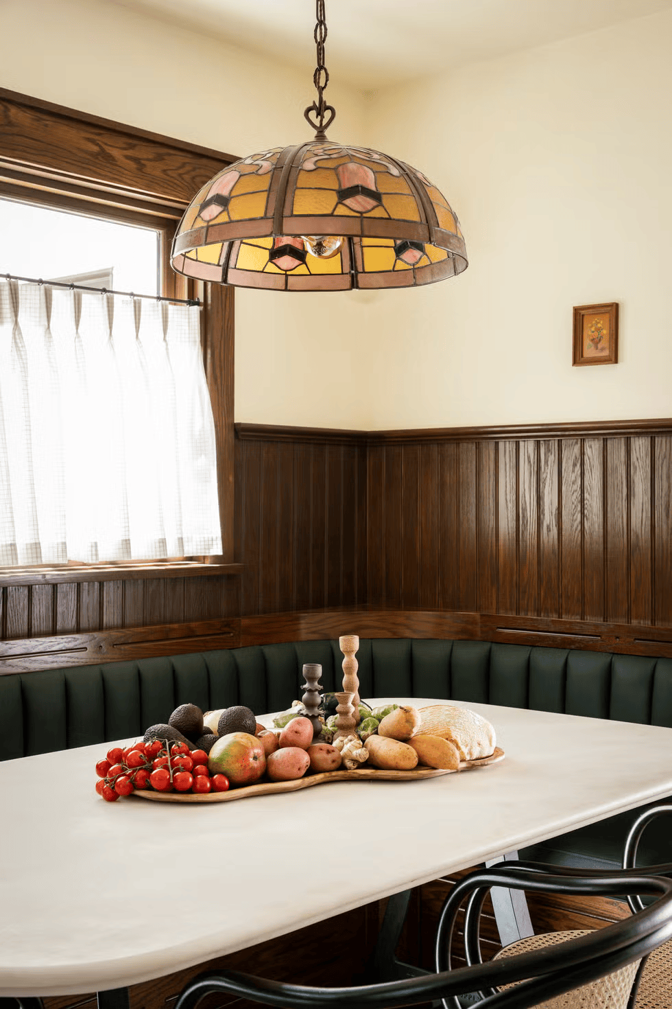 Ο στόχος της Phillips ήταν να διατηρήσει την ιστορική ταυτότητα του σπιτιού, ενώ ταυτόχρονα να εισάγει φρέσκες, παιχνιδιάρικες λεπτομέρειες που θα κάνουν τον χώρο να νιώθει οικείος και χαρούμενος. Έτσι, προστέθηκε μια custom made πόρτα από Judson Studios με βιτρό, χάλκινες λεπτομέρειες, φλοράλ μοτίβα και χαρακτηριστικές καμάρες, τα οποία δίνουν μια παραμυθένια αισθητική. Επιπλέον, τα βοηθητικά έπιπλα της εισόδου, όπως η κρεμάστρα για τα παλτό και τα αποθηκευτικά ντουλάπια φτιάχτηκαν με τέτοιο τρόπο ώστε να φαίνονται παλιά, σε συνδυασμό με τις αντίκες, ενώ τα πλακάκια του πατώματος περάστηκαν με ένα ειδικό γλάσο που τα κάνει να φαίνονται πιο vintage.