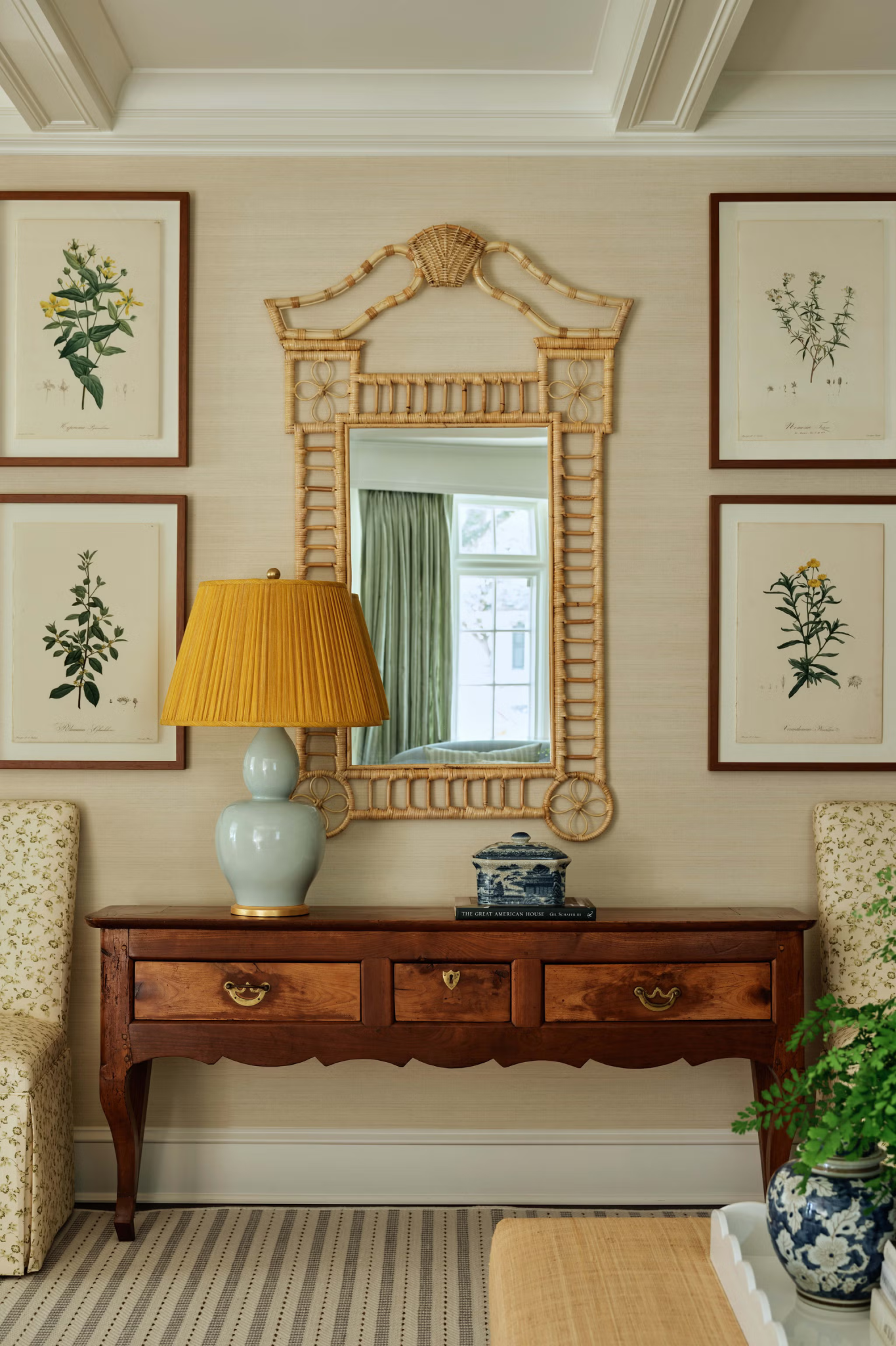 Ένα χαλί από άκρη σε άκρη από Kanter’s Carpet & Home συμπληρώνει την απαλή ταπετσαρία από Cowtan & Tout και το χαρακτηριστικό vintage έπιπλο κονσόλα από Chairish. Η επιπλεόν συλλογή με vintage prints και κομμάτια δίνει προσωπικότητα στον χώρο και προσθέτουν βάθος στην αισθητική.