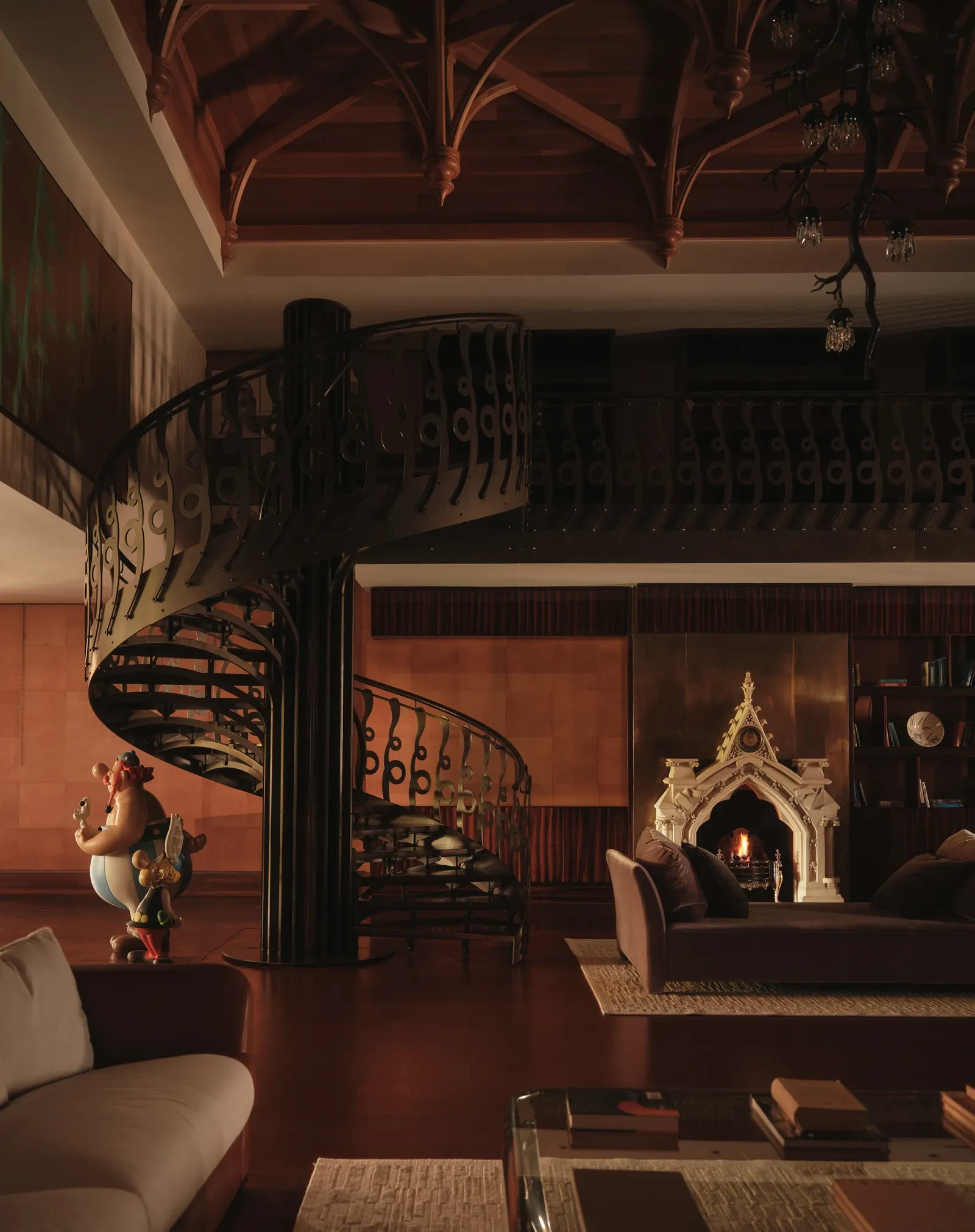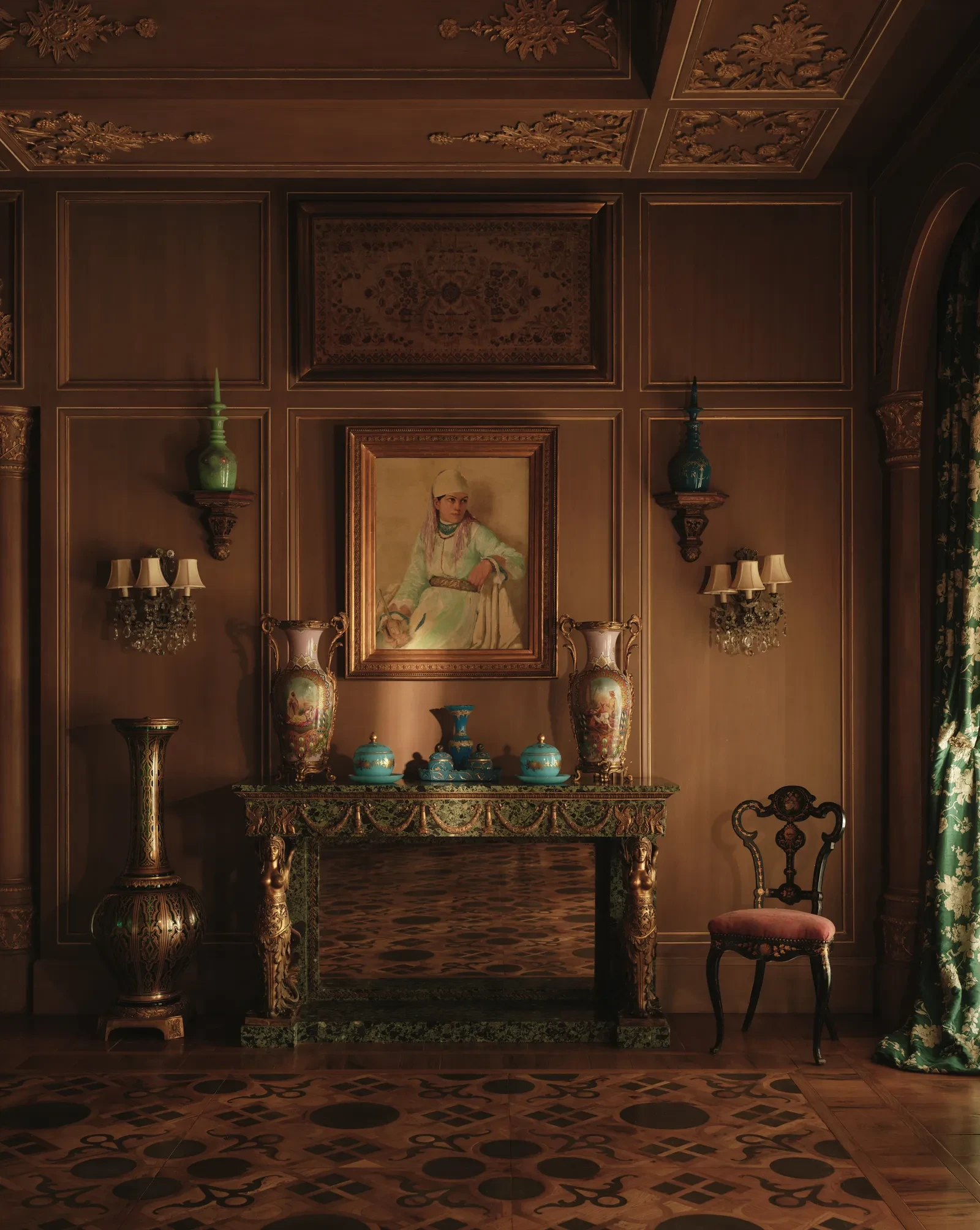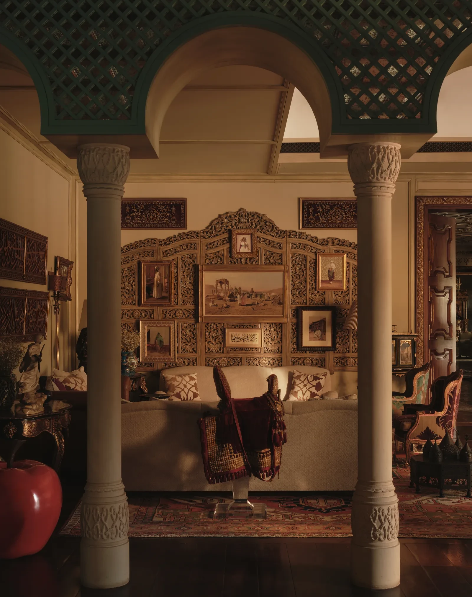 Στο κεντρικό σαλόνι, η El Tanani μεταμόρφωσε μια περίτεχνη ινδική οθόνη σε έκθεση σπάνιων έργων τέχνης, των οποίων τα μοτίβα αντηχούν με την αψιδωτή κιονοστοιχία που εμπνέεται από την ισλαμική αρχιτεκτονική. Στην ίδια ενότητα, αιγυπτιακά έργα και φιγούρες των δυναστειών Tang και Ming συνυπάρχουν με σύγχρονα έργα των Fernando και Humberto Campana, δημιουργώντας έναν διάλογο ανάμεσα στο παλιό και το νέο. Το μικρό σαλόνι φιλοξενεί μια εντυπωσιακή βενετσιάνικη κασέλα, στο κέντρο της οικογενειακής ζωής, περιβαλλόμενη από οριενταλιστικούς πίνακες του 18ου και 19ου αιώνα που απεικονίζουν φανταστικά ταξίδια και μακρινούς προορισμούς.
