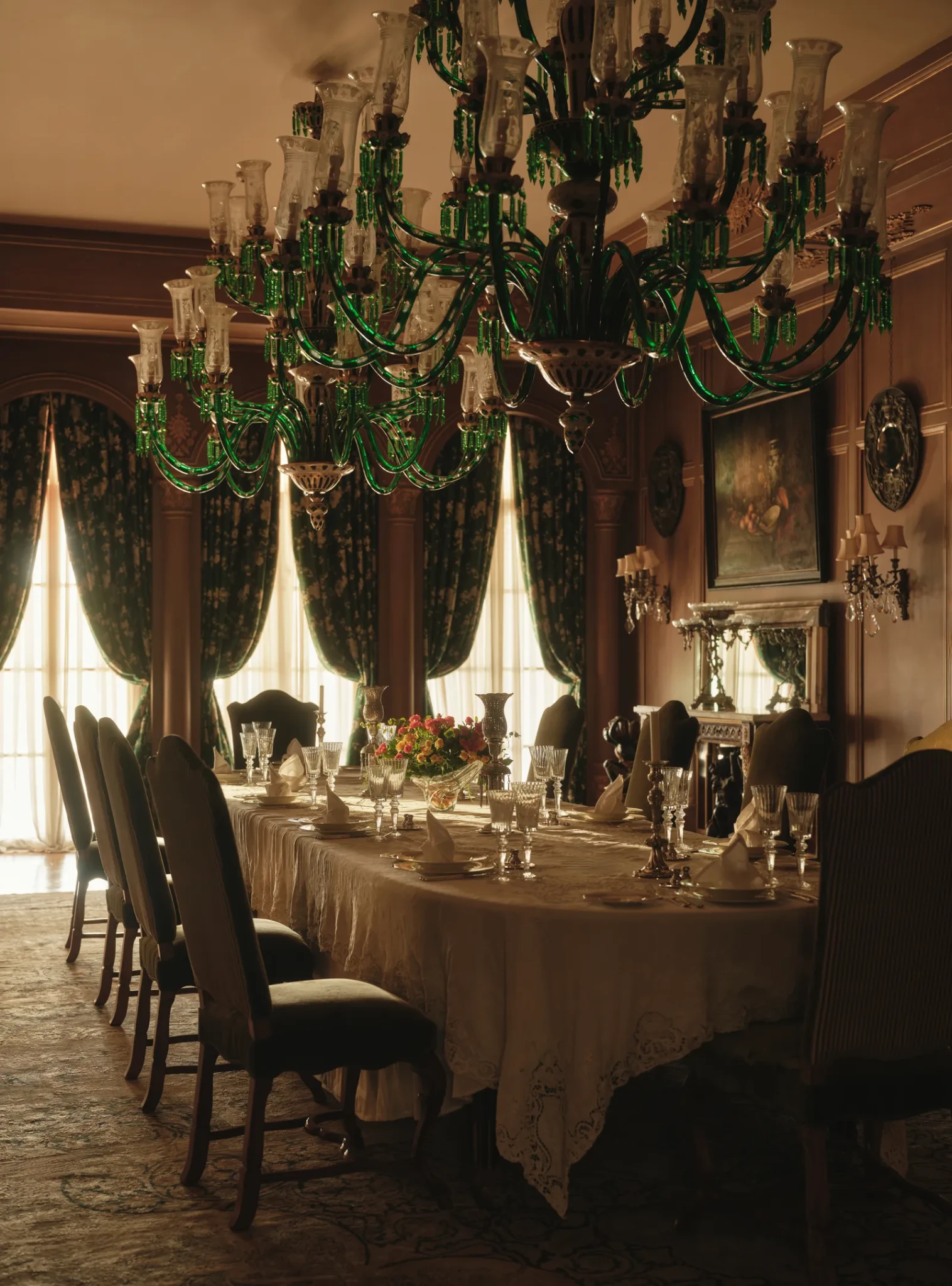 Στην κύρια τραπεζαρία, η πολυχρωμία, τα μοτίβα και η δεξιοτεχνία συνθέτουν μια οπτική πανδαισία. Ένα γαλλικού στιλ τραπέζι συνοδεύεται από βενετσιάνικες βελούδινες καρέκλες του 17ου αιώνα, ενώ γύρω του εκτίθενται σπάνια αιγυπτιακά βάζα Sèvres αρχών 20ού αιώνα, παλαιά σουζάνι υφάσματα από την Τουρκία και πίνακες αιγυπτιακών ζωγράφων του μεσοπολέμου. Η ατμόσφαιρα του δωματίου είναι ζωντανή, πλούσια και γεμάτη ιστορία, προσκαλώντας τους καλεσμένους να απολαύσουν την πολυπολιτισμική αρμονία.