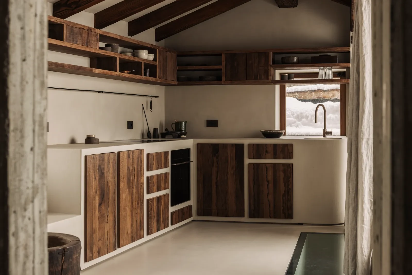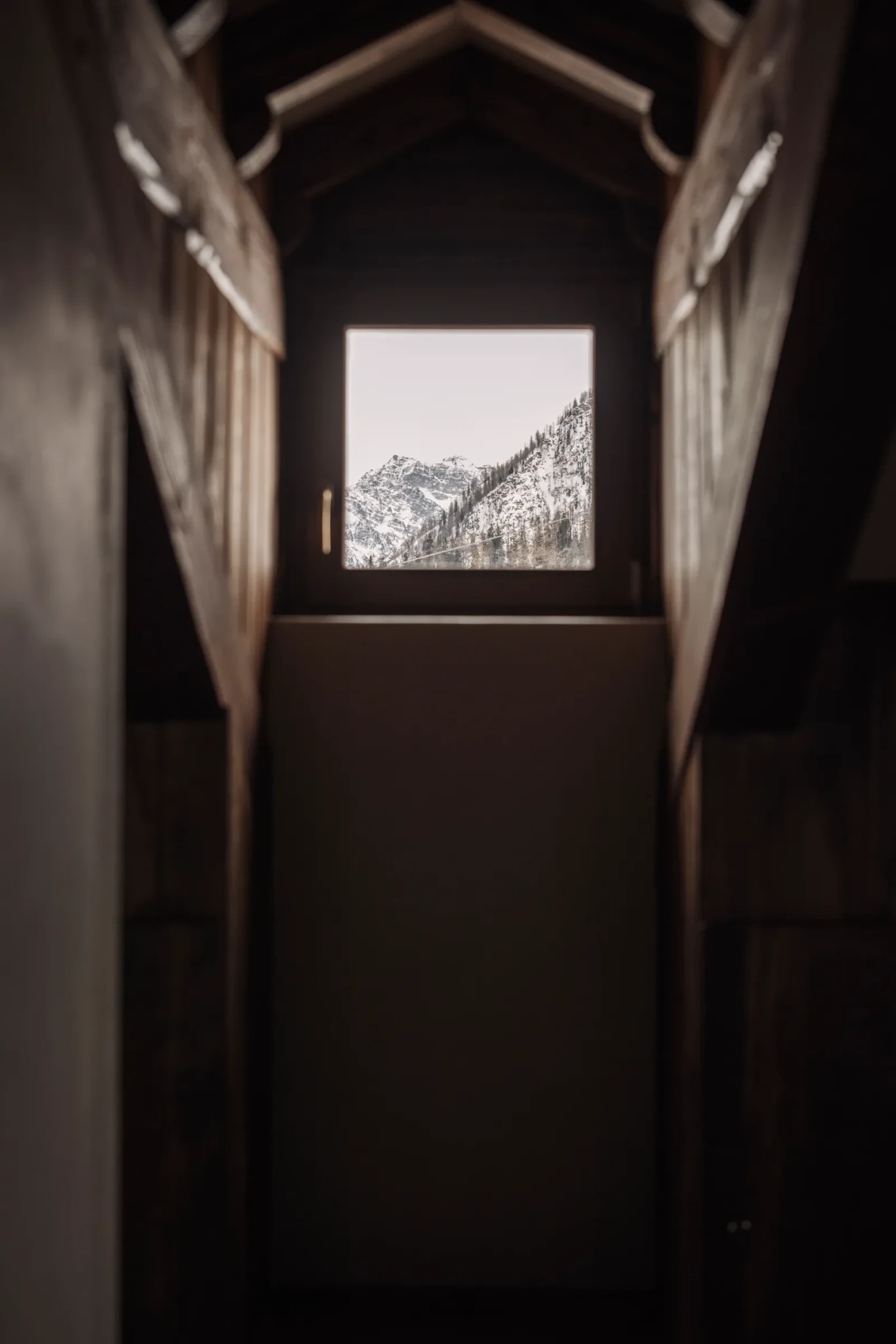 Η επιλογή των υλικών αντανακλά τον βαθύ σεβασμό των δημιουργών προς το περιβάλλον των Άλπεων. Το ξύλο του λάρικου, χαρακτηριστικό της ορεινής περιοχής, χρησιμοποιήθηκε σε ποικίλες εφαρμογές - από την επένδυση των τοίχων και τις κουζίνες μέχρι τα έπιπλα και τα κουφώματα. Κάθε σανίδα επιλέχθηκε προσεκτικά, ανάλογα με τη χρήση και τη θέση της, δημιουργώντας μια φυσική συνέχεια από το εξωτερικό στο εσωτερικό.