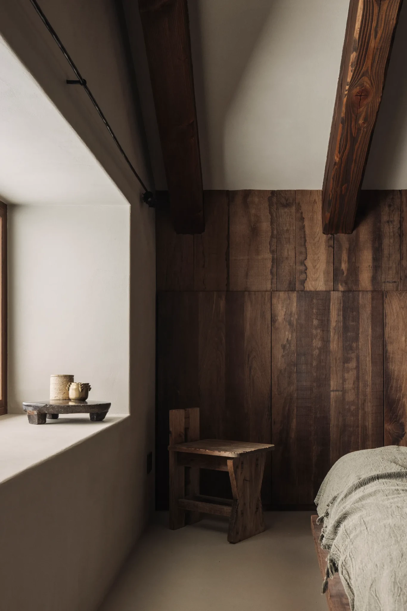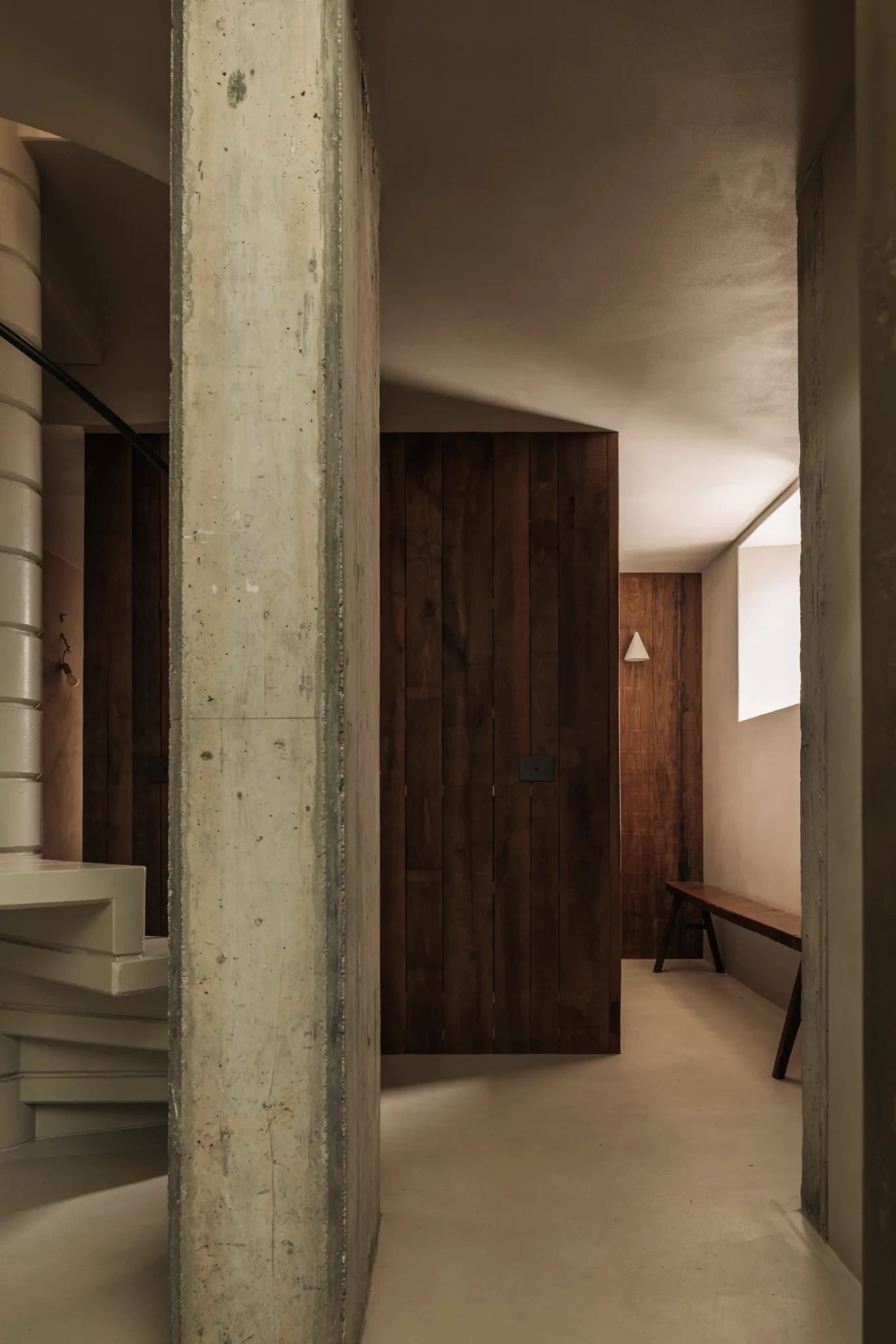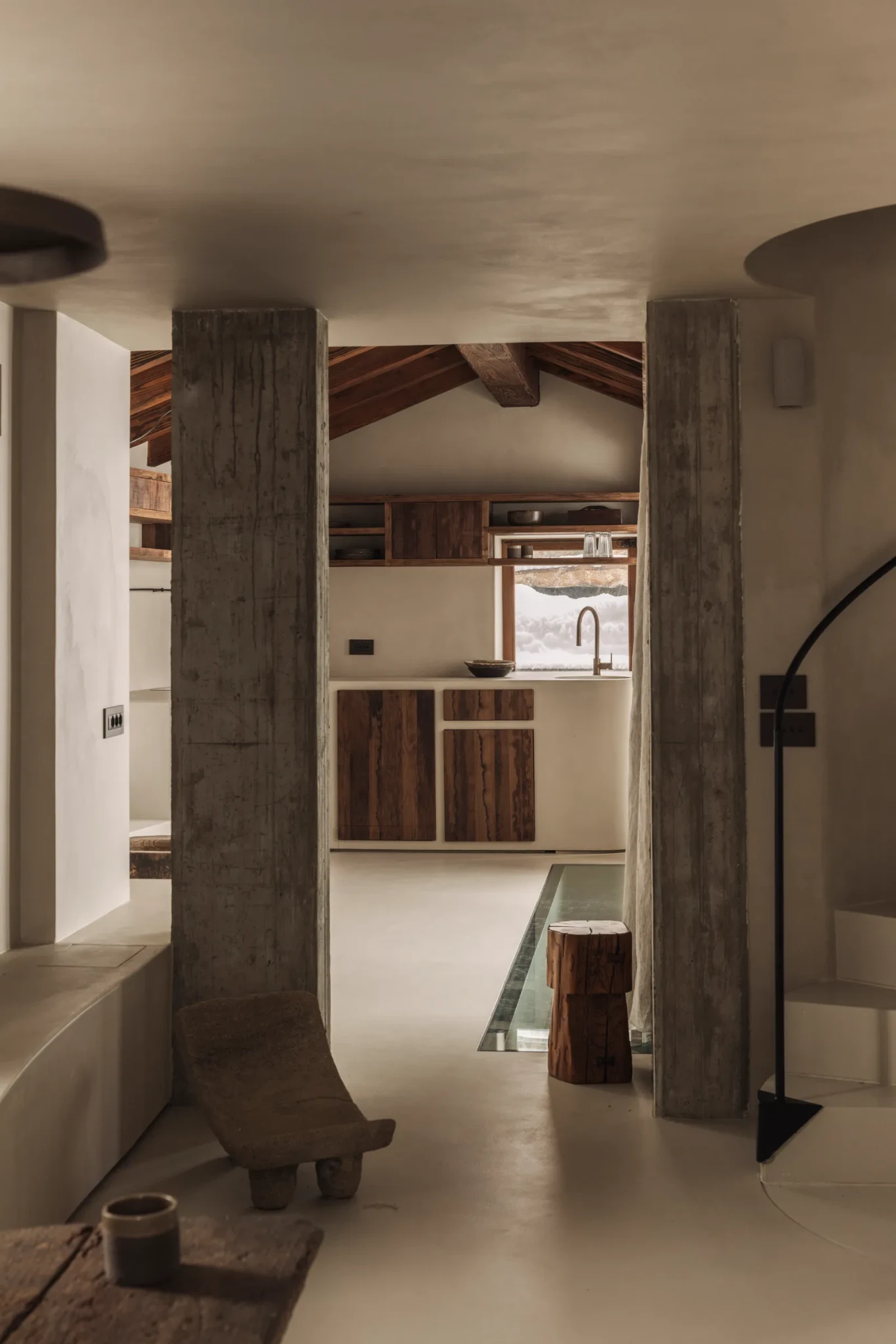 Στο εσωτερικό, η αισθητική ακολουθεί τη φιλοσοφία της ηρεμίας και του μέτρου. Οι χώροι παραμένουν λιτοί, χωρίς περιττά διακοσμητικά στοιχεία, αφήνοντας τα υλικά να αφηγηθούν τη δική τους ιστορία. Η διακόσμηση περιορίζεται σε λίγα vintage έπιπλα από την περιοχή, που φέρουν τη γοητεία του χρόνου και την απλότητα της τοπικής παράδοσης. Οι υφές των υλικών, το φυσικό φως και οι σκιές που εναλλάσσονται καθ’ όλη τη διάρκεια της ημέρας συνθέτουν ένα ήρεμο, σχεδόν διαλογιστικό σκηνικό.
