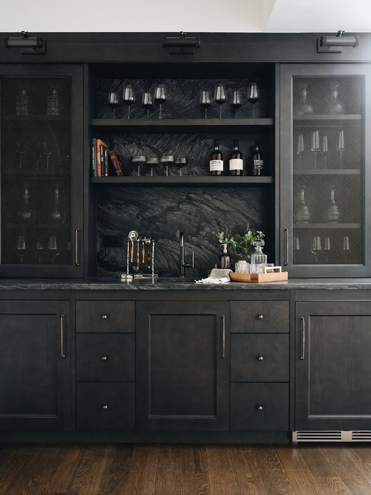 «Για μένα, τα πιο σκούρα χρώματα δίνουν ζεστασιά και θαλπωρή, που αγαπώ πολύ», λέει η Thompson, ιδρύτρια της Urbane Home, γνωστής για τις πολυτελείς αναπτύξεις της στην πόλη. «Όταν τα συνδυάζεις με ξύλο, υφές και φυσικό φως, το αποτέλεσμα είναι γήινο και φέρνει το απαραίτητο cozy αίσθημα στον χώρο.» Αυτή η φιλοσοφία διαμόρφωσε ένα από τα πιο φιλόδοξα έργα της: τη μετατροπή μιας κατοικίας 150 ετών στην Old Town του Σικάγο, μια γοητευτική γειτονιά με λιθόστρωτους δρόμους και πλούσια πολιτιστική ιστορία.