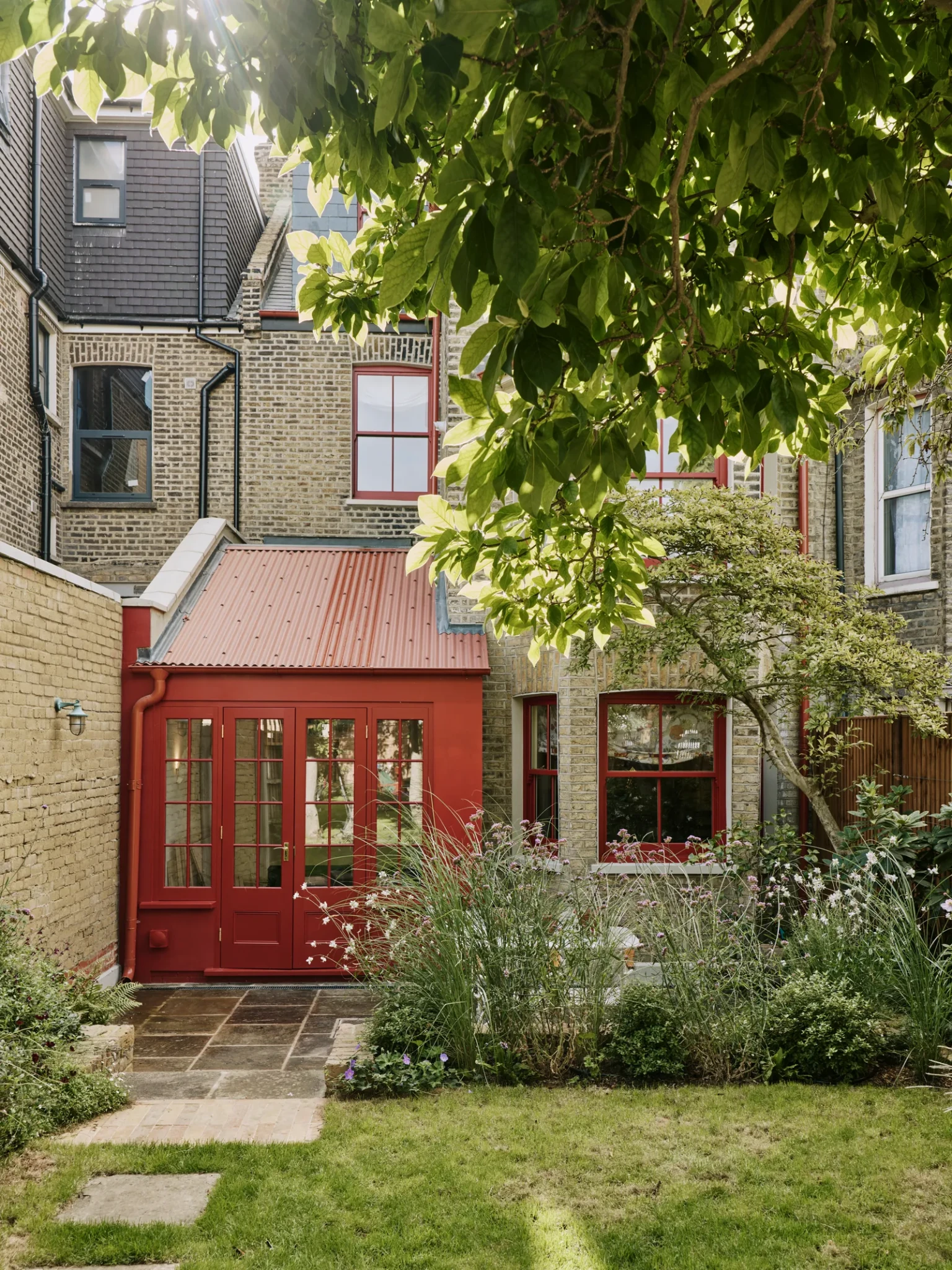 Το εξωτερικό του σπιτιού είναι εξίσου εντυπωσιακό. Η νέα επέκταση ντύθηκε με έντονο κόκκινο, αρμονισμένο με τα παράθυρα, ενώ η στέγη καλύφθηκε με κυματοειδές μέταλλο, προσδίδοντας με αυτόν τον τρόπο μοντέρνο χαρακτήρα. Πρόκειται για μία τολμηρή επιλογή που δημιουργεί αντίθεση με την ουδέτερη και ήρεμη παλέτα των εσωτερικών χώρων, ενώ παράλληλα τιμά την ιστορική ταυτότητα του κτιρίου.