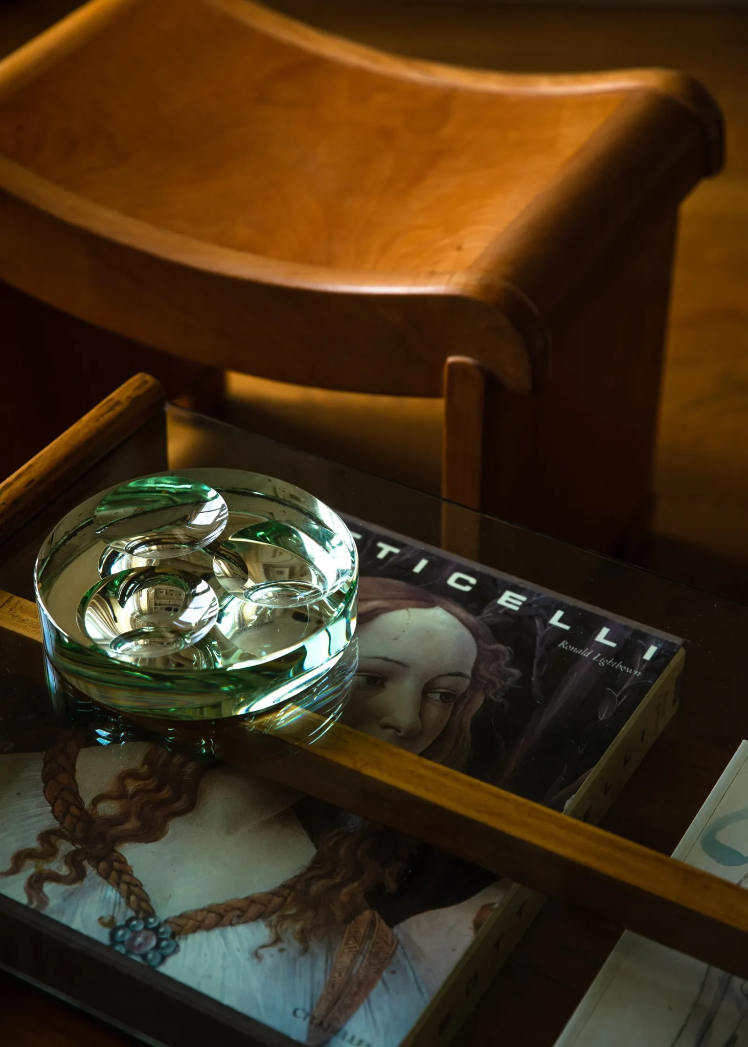 Η τραπεζαρία λειτουργεί ταυτόχρονα ως χώρος εργασίας, ανάγνωσης και περισυλλογής, περιβαλλόμενη από βιβλία και αντικείμενα με έντονη συναισθηματική αξία. Παρά τον πνευματικό της ρόλο, η ατμόσφαιρα παραμένει παιχνιδιάρικη και ζωντανή: πολύχρωμα γλυπτικά στοιχεία, έπιπλα με ιδιαίτερη μορφολογία και έργα τέχνης συνθέτουν ένα σκηνικό που ενθαρρύνει τη δημιουργικότητα και την ελεύθερη σκέψη. Σε όλο το σπίτι, η έμπνευση από τον Κλιμτ επανέρχεται διακριτικά, μέσα από την ισορροπία ανάμεσα στην πειθαρχία και την εκφραστικότητα.