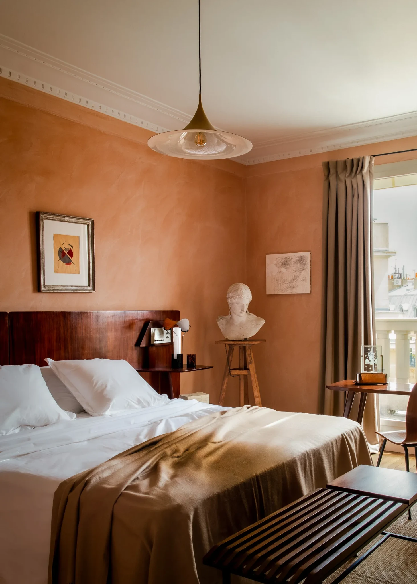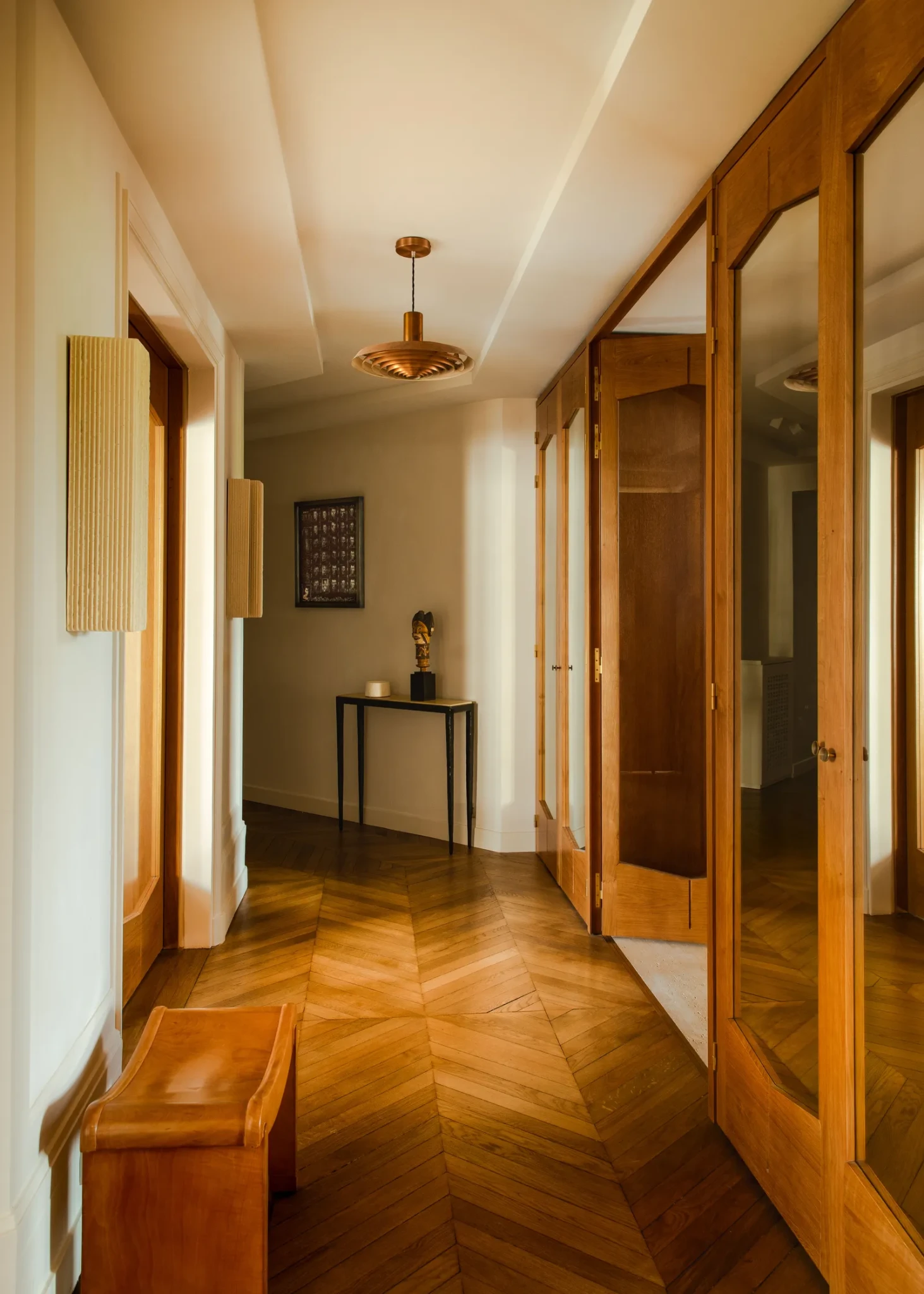Ο στόχος της Μπενχαμού ήταν να δημιουργήσει έναν χώρο ταυτόχρονα ανοιχτό και προστατευτικό, ένα «ήρεμο κουκούλι» μέσα στον αστικό ιστό του Παρισιού. Η αναδιαμόρφωση της κάτοψης επιτρέπει στο φυσικό φως να διαχέεται ελεύθερα από δωμάτιο σε δωμάτιο, ενισχύοντας την αίσθηση συνέχειας και ροής. Ειδικά σχεδιασμένες δρύινες ντουλάπες, εμπλουτισμένες με καθρέφτες και γυάλινες επιφάνειες, παραπέμπουν στην Art Deco ξυλουργική, αποπνέοντας όμως μια σύγχρονη, αιθέρια ελαφρότητα.