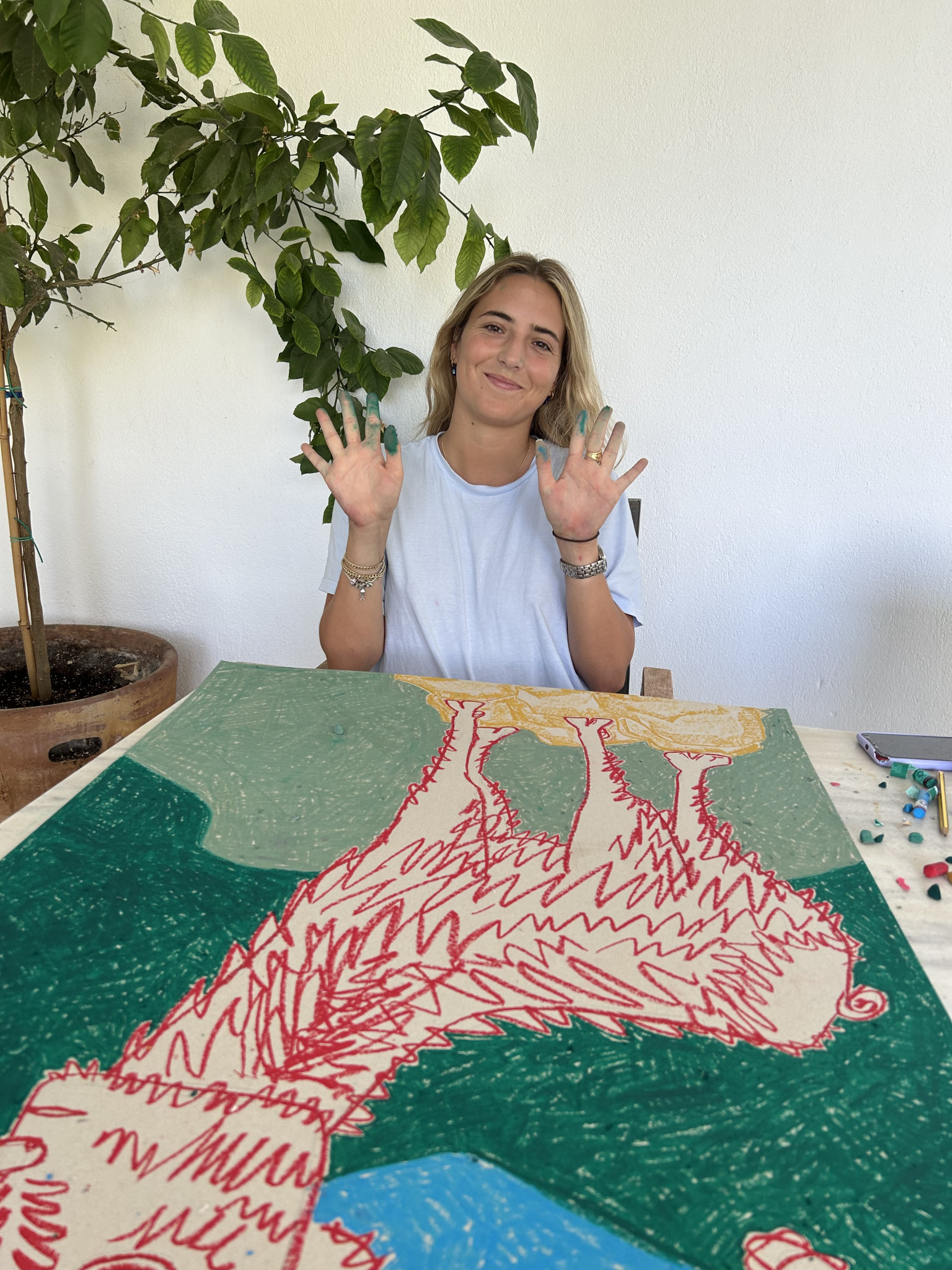 Όταν δε ζωγραφίζω, μαθαίνω σε άλλους πώς να το κάνουν! Τα τελευταία τρία χρόνια έχω αναλάβει Υπεύθυνη Καλλιτεχνικού Προγράμματος στο Νηπιαγωγείο του Κολλεγίου Αθηνών. Δουλεύω με τους μικρούς μαθητές μου, οργανώνω και επιμελούμαι μεγάλες εικαστικές εκθέσεις που τους φέρνουν σε επαφή με καταξιωμένους καλλιτέχνες και προσπαθώ να είμαι η art teacher που ήθελα να έχω όταν ήμουν και εγώ στο σχολείο. Όταν δεν κάνω ούτε αυτό, πάλι δουλεύω με τα χέρια μου, μαγειρεύω ή κάνω κηπουρική - οτιδήποτε μπορώ για να μένουν τα χέρια μου μονίμως λερωμένα!