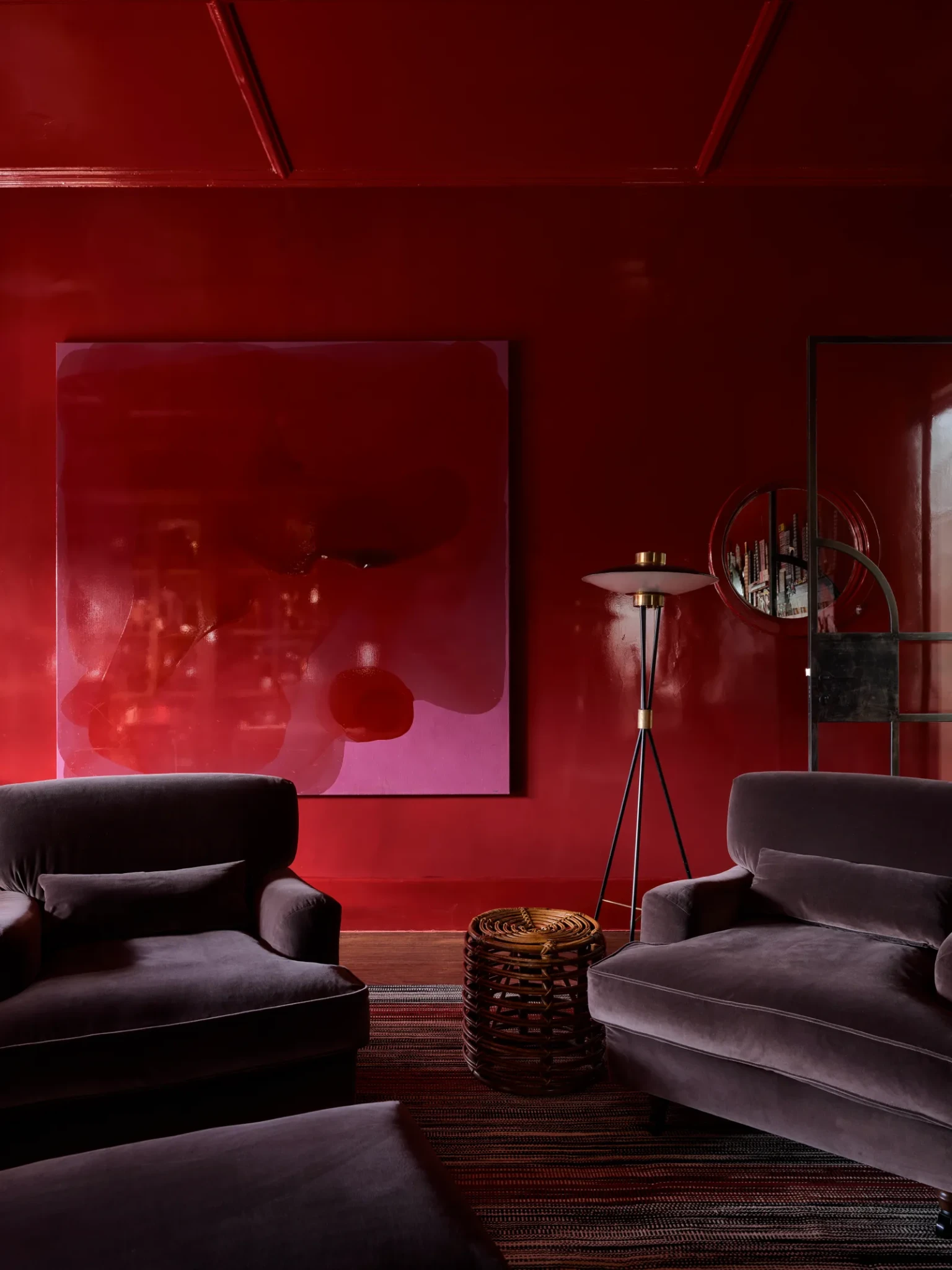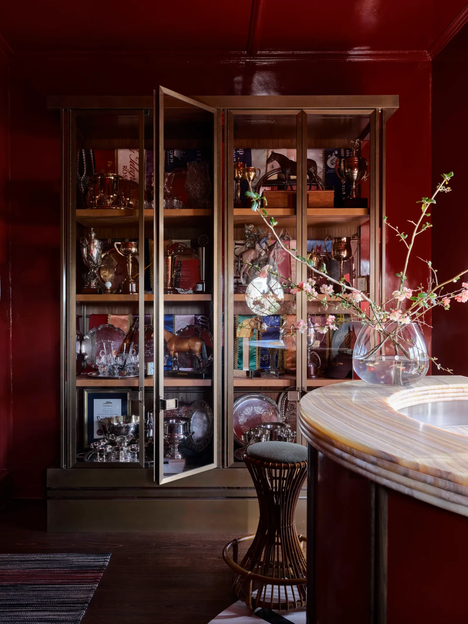 Η χρωματική παλέτα και η επιλογή υλικών ενισχύουν τη ζωντάνια του σπιτιού. Το cocktail lounge στο μπροστινό μέρος βαφτίστηκε σε βαθύ κόκκινο, φωτίζοντας τις γωνίες και προσθέτοντας ζεστασιά, ενώ η σκούρα πράσινη οροφή της τραπεζαρίας, με την καθρεφτισμένη της επιφάνεια, αντανακλά τον κήπο και δημιουργεί οπτικό διάλογο με τη φύση. Οι μαρμάρινες και terrazzo επιφάνειες, τα bespoke δάπεδα και οι λεπτομέρειες σε ασπρόμαυρο μαρμάρινο σχέδιο στην βιβλιοθήκη προσθέτουν χαρακτήρα και συνδέουν αρμονικά το ιστορικό με το σύγχρονο, δημιουργώντας ένα περιβάλλον που φαίνεται ταυτόχρονα διαχρονικό και παιχνιδιάρικο.