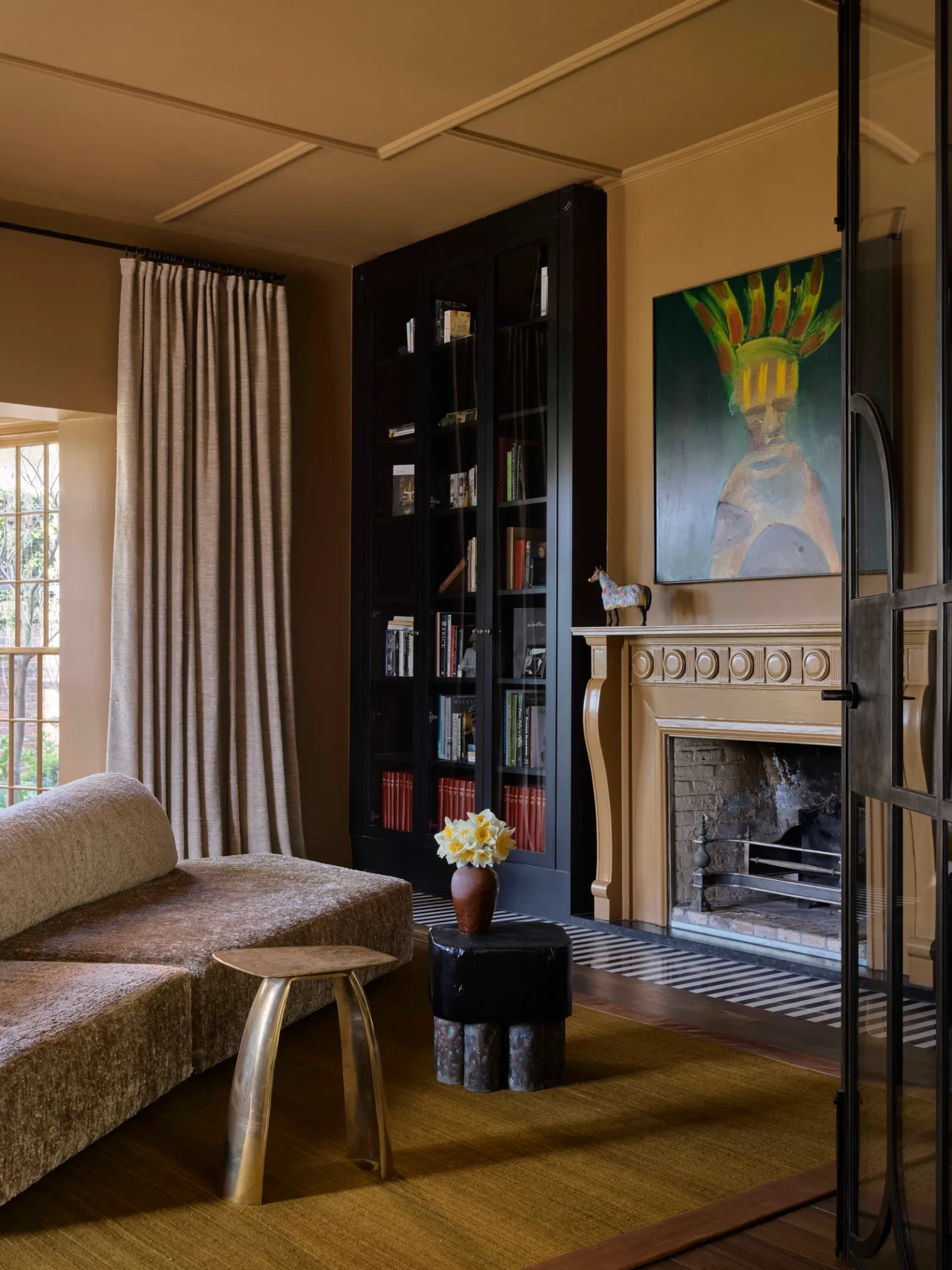 Ο αρχικός, επίσημος σχεδιασμός του σπιτιού περιορίζει τη χρήση πολλών δωματίων. Με προσεκτική επιλογή vintage, contemporary και custom επίπλων, ο Flack μεταμόρφωσε κάθε χώρο σε λειτουργικό και ευέλικτο. Η βιβλιοθήκη, βαμμένη σε βαθύ ώχρα, φιλοξενεί τον δίπλευρο καναπέ 'On the Rocks' του Francesco Binfaré για Edra και μπορεί να χρησιμοποιηθεί ως home office, χώρος μελέτης ή μικρής κοινωνικής συγκέντρωσης. Η κουζίνα, με άνετο μπανκέτ και τραπέζι, γίνεται το καθημερινό σημείο συνάντησης της οικογένειας, ενώ ταυτόχρονα φιλοξενεί μεγαλύτερες συγκεντρώσεις με φίλους, συνδυάζοντας λειτουργικότητα με ζεστή, καθημερινή ατμόσφαιρα.