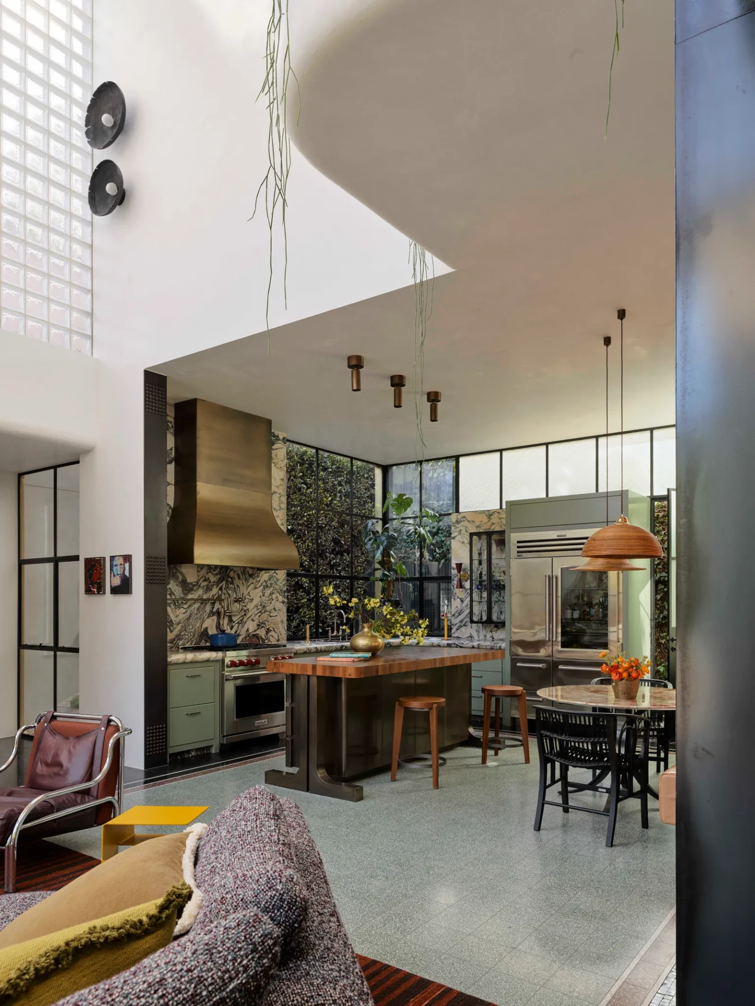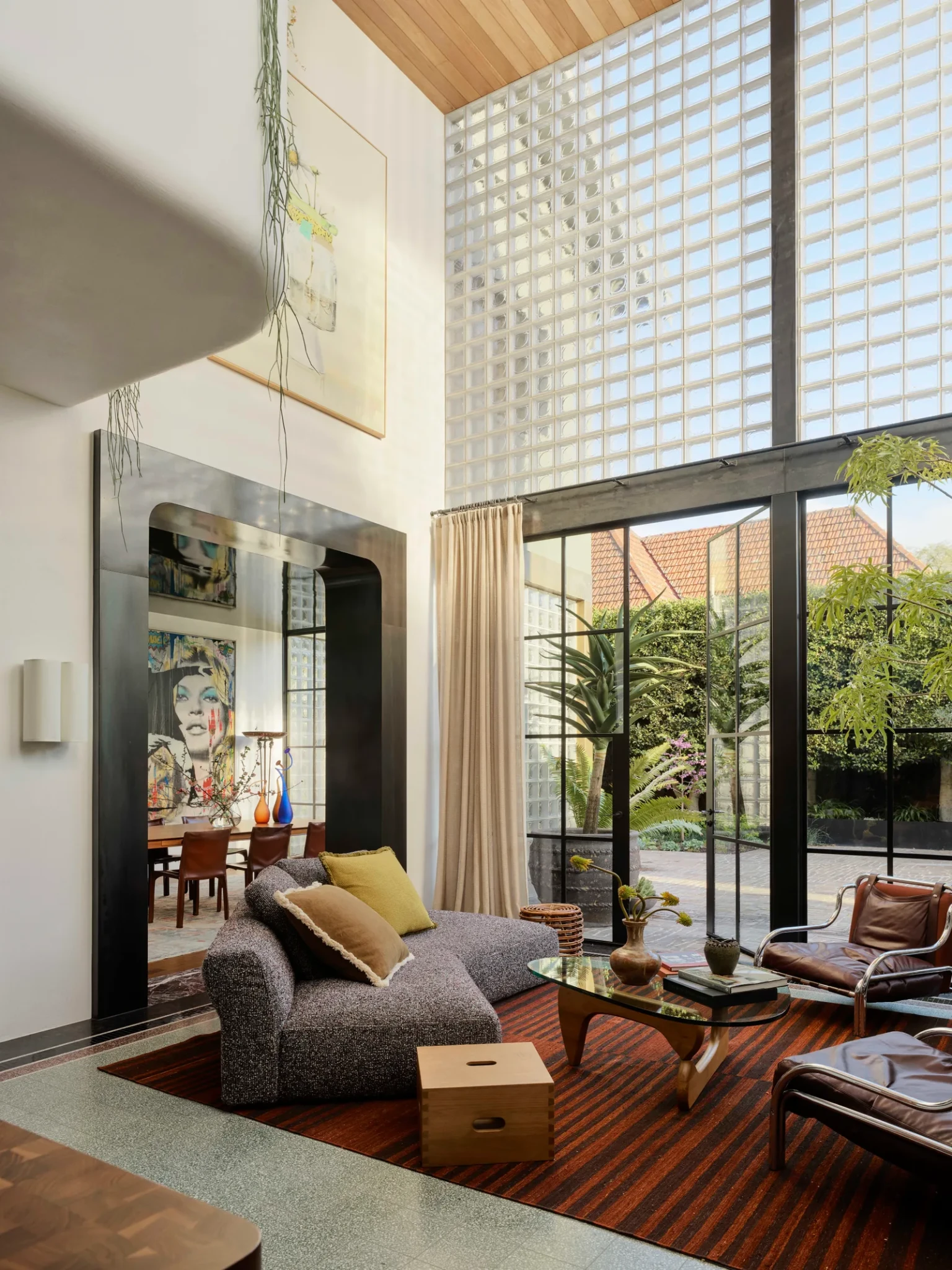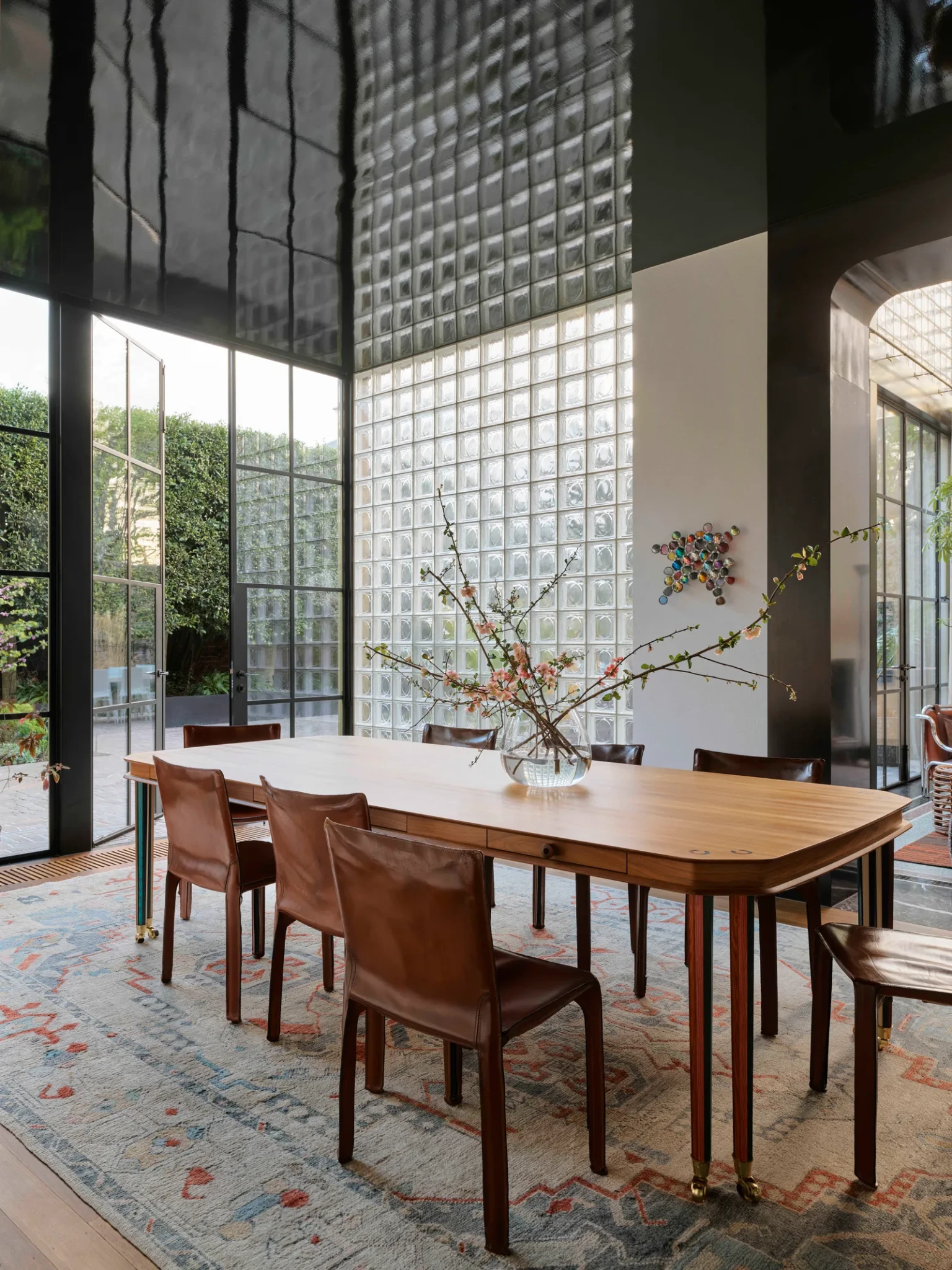 Η χρήση γυάλινων τούβλων ως δομικό στοιχείο εμπνεύστηκε από την ιστορική Maison de Verre στο Παρίσι (1932) και σηματοδοτεί το πρώτο αρχιτεκτονικό έργο του Flack Studio, που πλέον έχει επεκταθεί με επτά ακόμη projects. Ο διπλού ύψους χώρος φιλοξενεί την κουζίνα, το σαλόνι και ένα powder room, δημιουργώντας μια συνεχόμενη ροή φωτός που διαχέεται σε όλο το σπίτι. Στο τραπεζαρία και το οικογενειακό δωμάτιο, τα γυάλινα τούβλα και τα παράθυρα με μεταλλικό σκελετό προσδίδουν διαφάνεια και ελαφρότητα, ενώ τα frosted γυάλινα στοιχεία στα μπάνια εξασφαλίζουν απαλή διάχυση φωτός, δημιουργώντας ατμόσφαιρα ηρεμίας και γαλήνης.