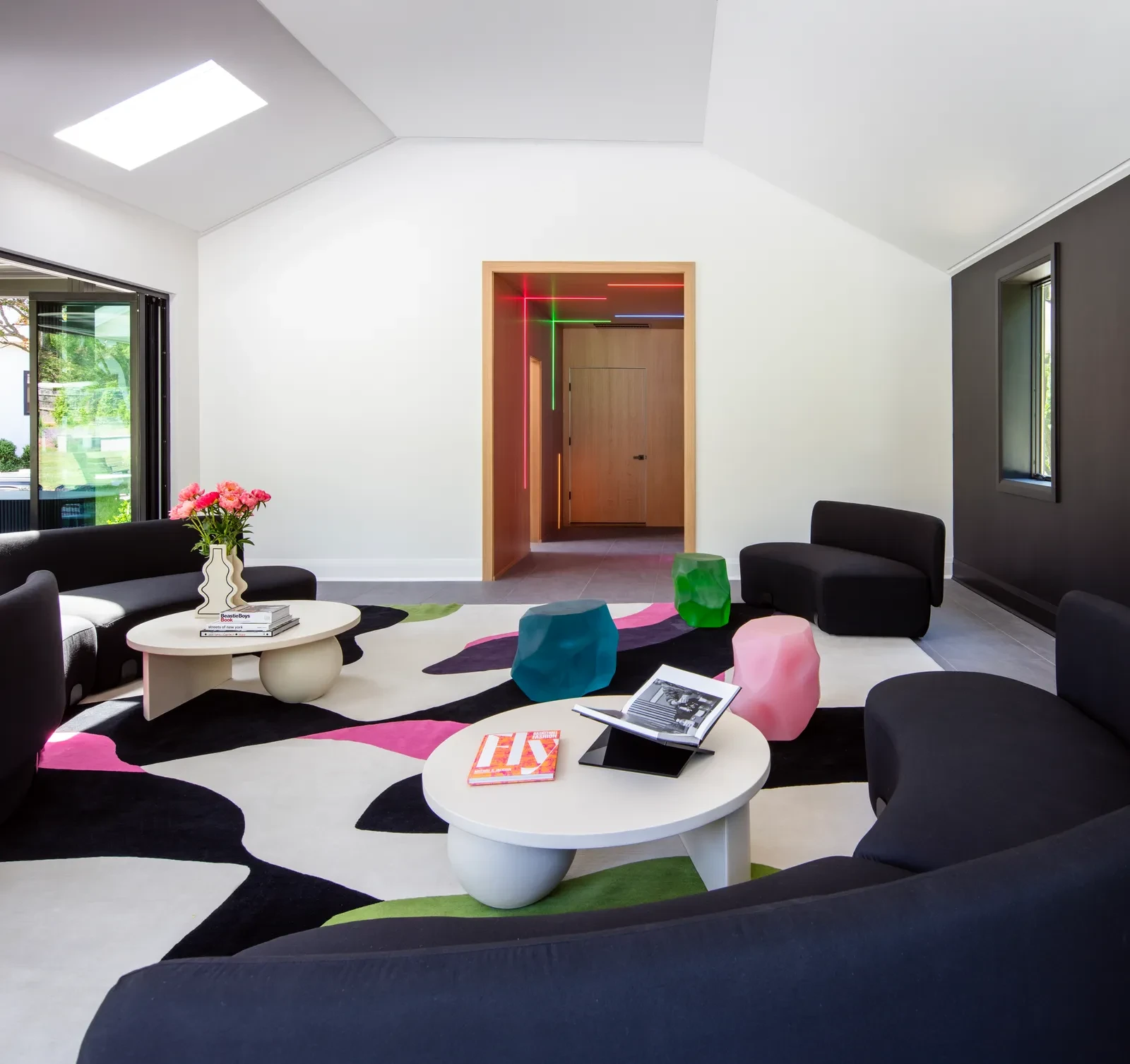 Το υπαίθριο καθιστικό που περιβάλλει την πισίνα είναι εξοπλισμένο με 'Rove Concepts' καναπέδες και γλυπτά από ρητίνη που θυμίζουν πολύτιμους λίθους, ενώ η θέα προς την αυλή μέσα από τα μεγάλα παράθυρα συμπληρώνει έναν ιδανικό χώρο για ανάπαυση και κοινωνική ζωή.