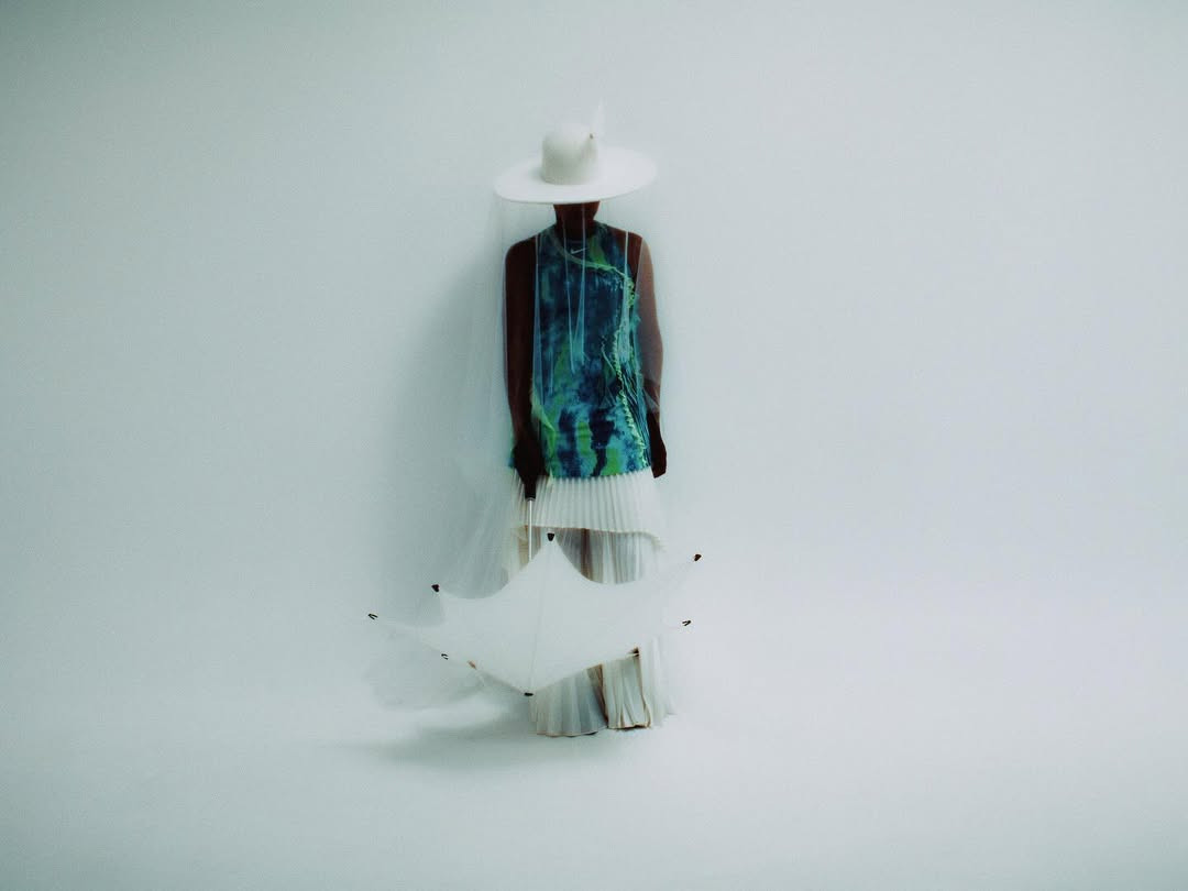 Η πλισέ μίνι φούστα φορεμένη πάνω από φαρδιά παντελόνα, το δραματικό καπέλο με φαρδύ γείσο και διάφανο λευκό πέπλο, αλλά και οι πεταλούδες που κοσμούσαν το καπέλο και την ομπρέλα, ολοκλήρωναν μια εικόνα σχεδόν ποιητική. Couture λεπτομέρειες, τοποθετημένες σε έναν χώρο που σπάνια φιλοξενεί τέτοια ένταση μόδας.