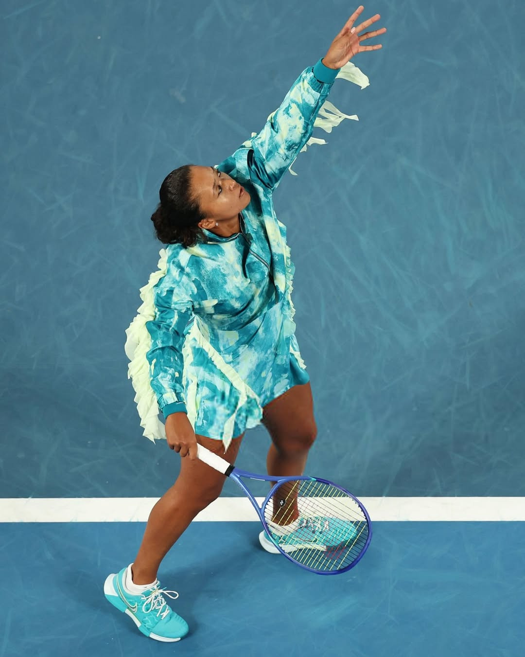 Το αποτέλεσμα ήταν ένα ocean-inspired σύνολο σε αποχρώσεις τιρκουάζ και πράσινου, με tie-dye υφή και οργανικά «πλοκάμια» να αιωρούνται από τα μανίκια του zip-up jacket. Συνδυασμένο με ένα ασορτί racerback και με λευκή φαρδιά παντελόνα με ruffles, το outfit κινούνταν με ρευστότητα, σχεδόν σαν να ήταν «ένα» με το σώμα της πρωταθλήτριας. Κι ενώ όλα έμοιαζαν άρτια, κάτι σαν να έλειπε. Μια λεπτομέρεια που θα απογείωνε το αρχικό σχέδιο.