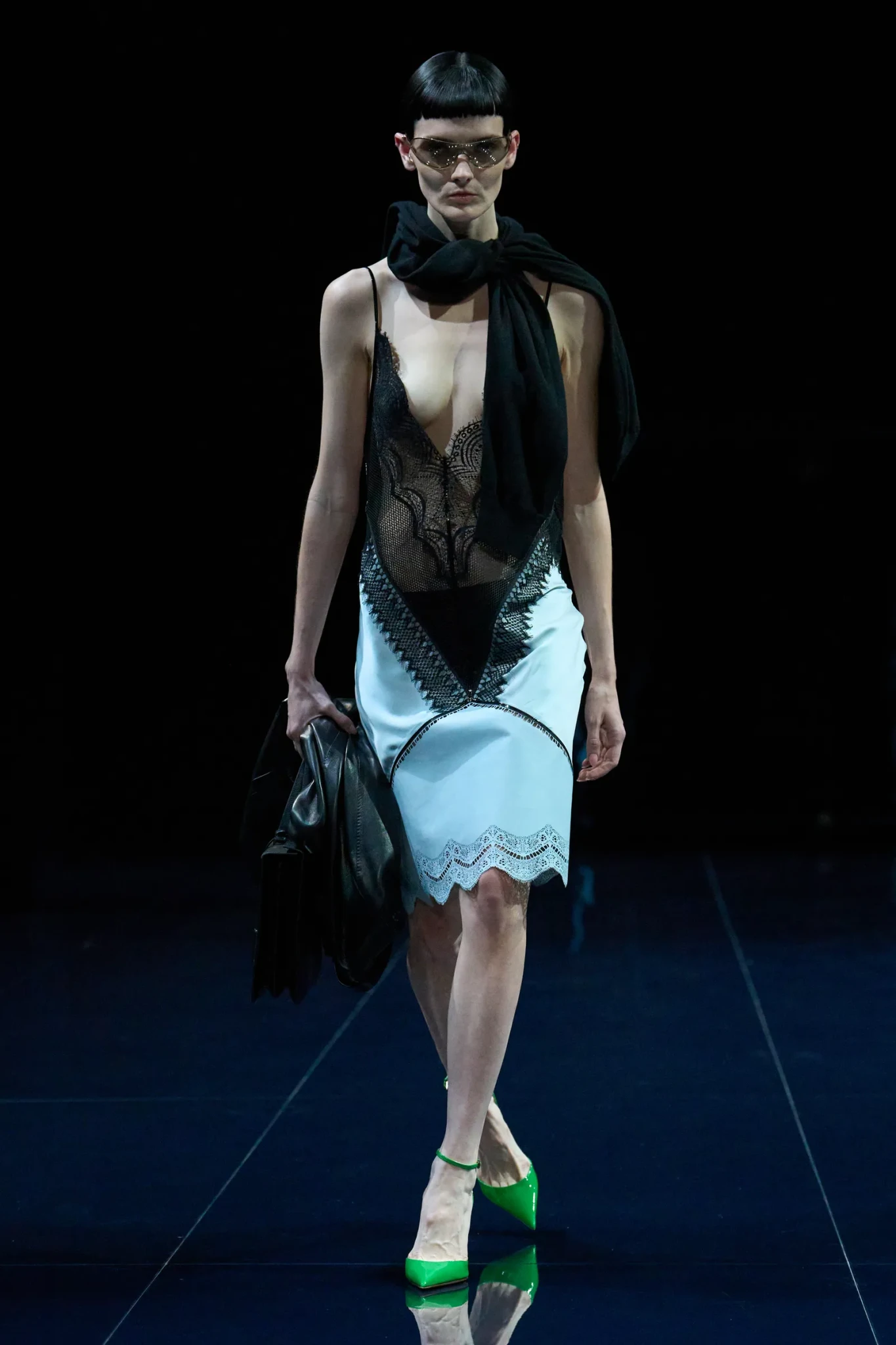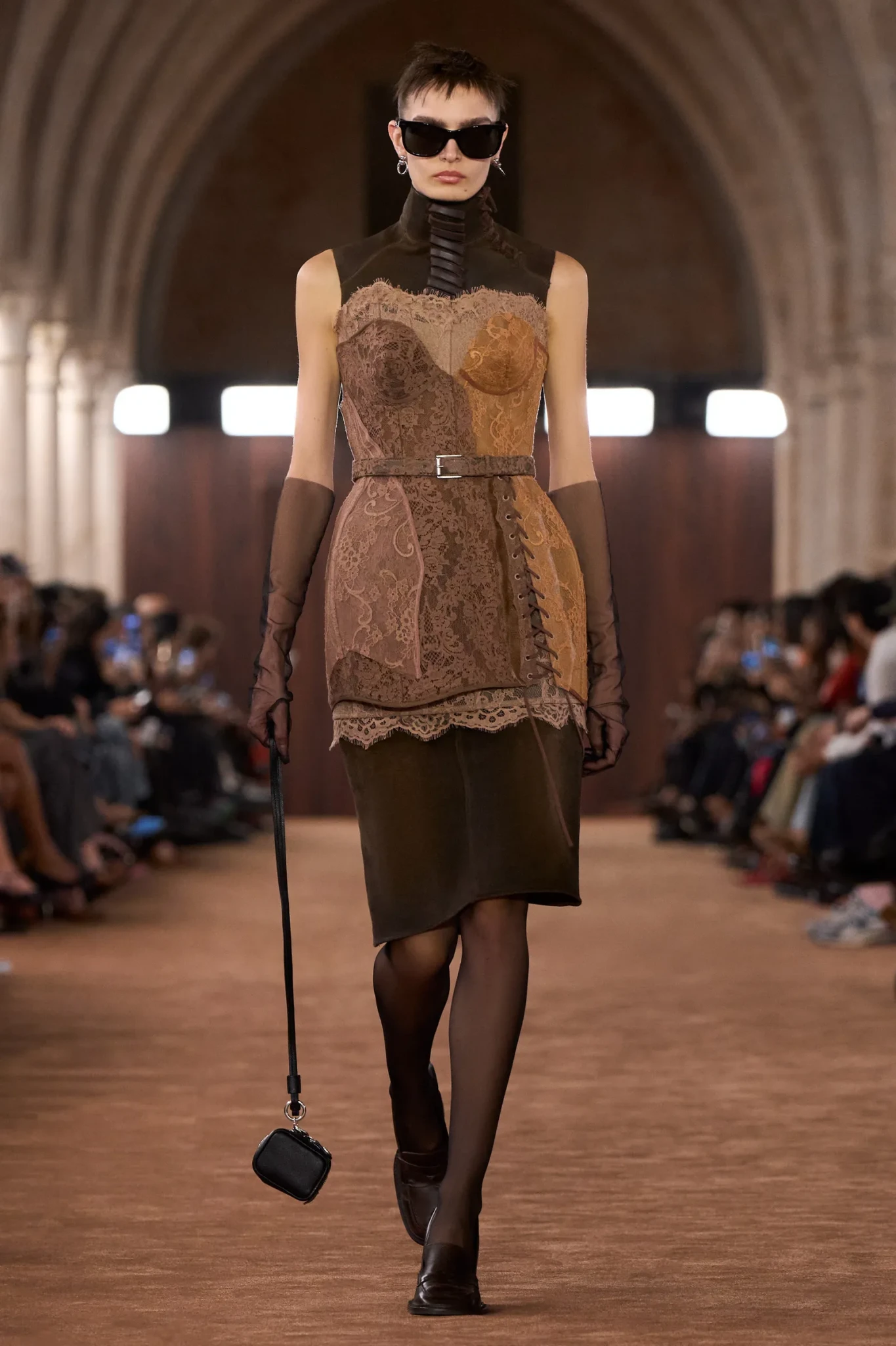 Οι σιλουέτες κινήθηκαν στο μεταίχμιο του ανδρόγυνου: σακάκια με ασύμμετρες γραμμές, πουκάμισα που «διαλύονταν» κάτω από στρώσεις δαντέλας, και διαφανή φορέματα που αποκάλυπταν το σώμα χωρίς ποτέ να το εκθέτουν πλήρως. Distressed denim και δέρμα συνδυάστηκαν με πιο ευαίσθητες υφές, δημιουργώντας ένα αποτέλεσμα που μοιάζει σκληρό και ευάλωτο ταυτόχρονα.