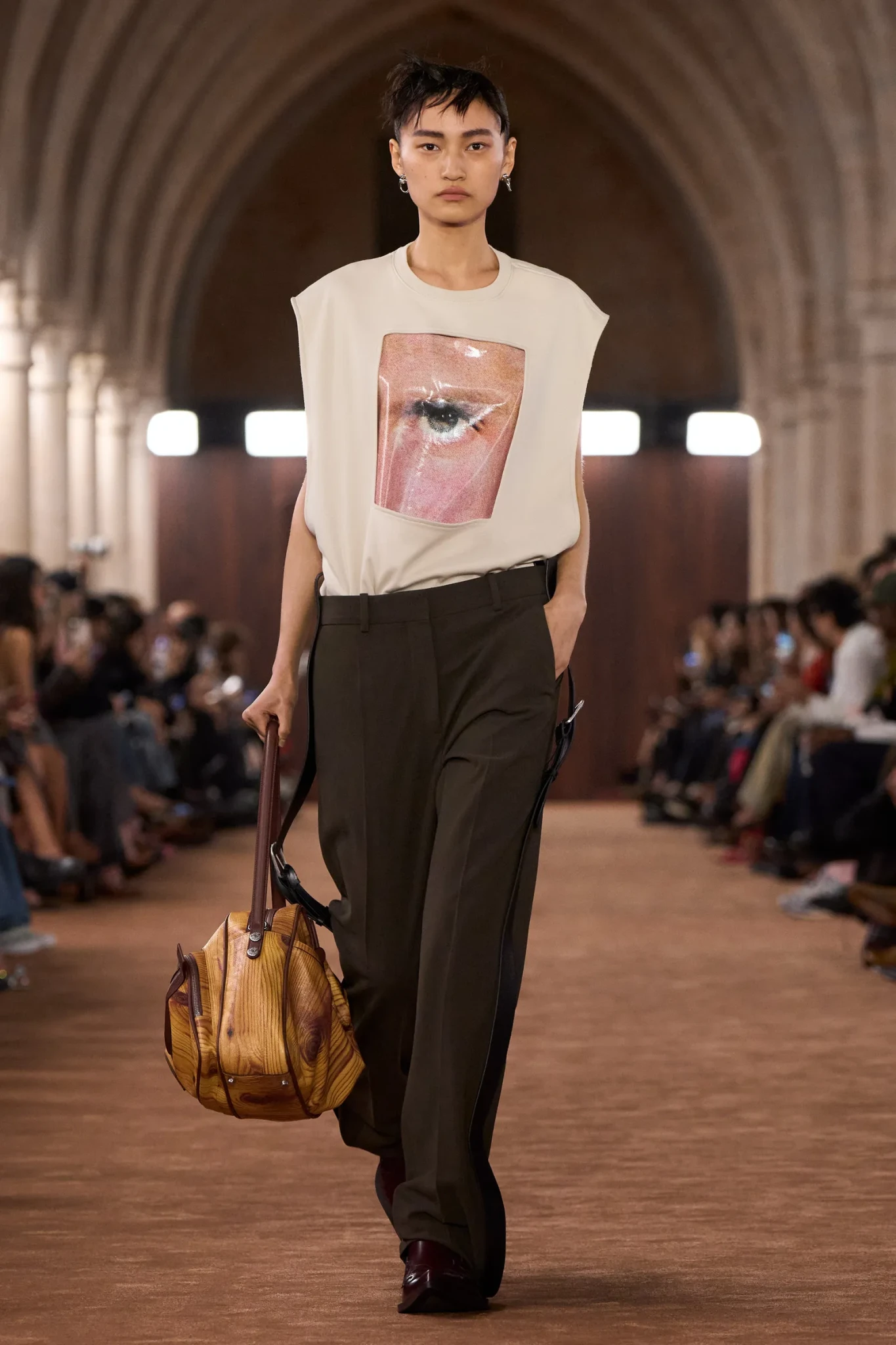 Η παλέτα περιορίστηκε σε ουδέτερους τόνους, με αιχμές dusty pink και πράσινου της μέντας, ενώ oversized τσάντες και έντονα σκουλαρίκια έδωσαν όγκο στο styling. Η μουσική επένδυση με Robyn και Yung Lean έδωσε στο show έναν σύγχρονο, συναισθηματικά φορτισμένο παλμό, ολοκληρώνοντας την εμπειρία.
