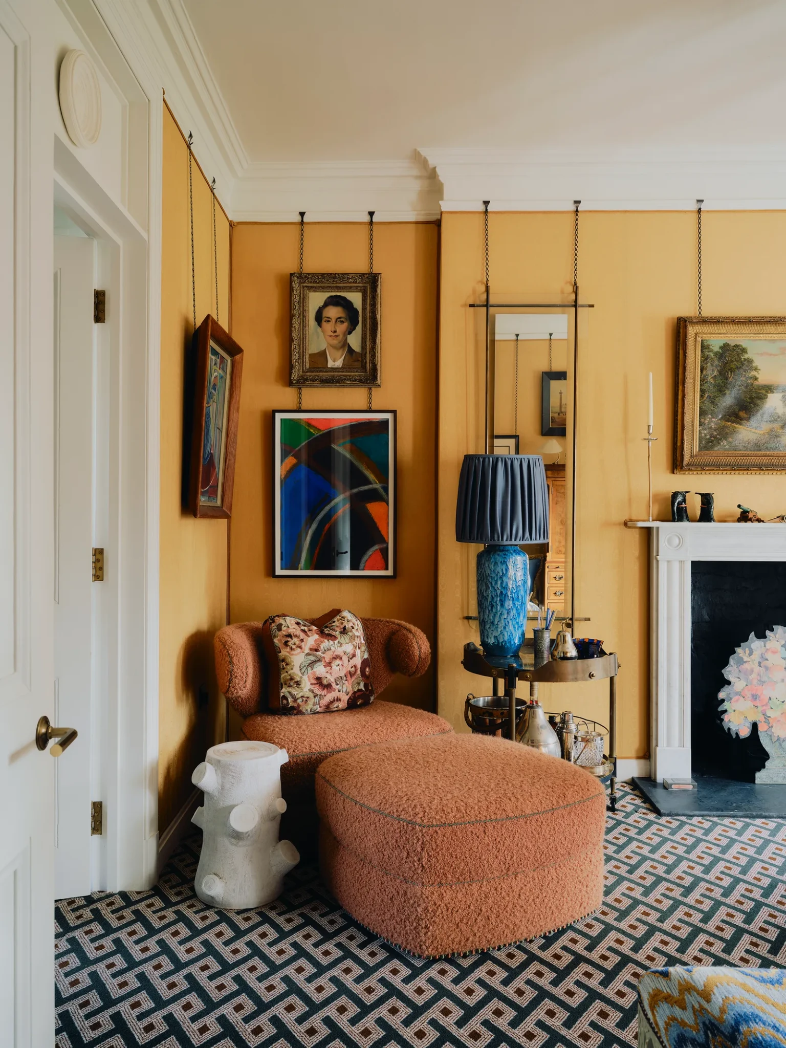 Το χρώμα παίζει κεντρικό ρόλο σε όλη την έκταση του σπιτιού. Από τους τοίχους μέχρι τα υφάσματα και τα χαλιά, οι αποχρώσεις δημιουργούν μια ζεστή και φωτεινή ατμόσφαιρα. Ένα από τα πιο εντυπωσιακά δωμάτια είναι το μεγάλο “drawing room”, όπου κυριαρχεί το κίτρινο, ένα χρώμα που ο Brudnizki επέλεξε για να θυμίζει φωτινές στιγμές, ακόμη και τις πιο σκοτεινές και χειμωνιάτικες ημέρες. Καθώς πέφτει το φως της ημέρας, τα φωτιστικά και τα κεριά δημιουργούν μια χρυσαφένια λάμψη, η οποία κάνει τον χώρο να μοιάζει σχεδόν κινηματογραφικός.