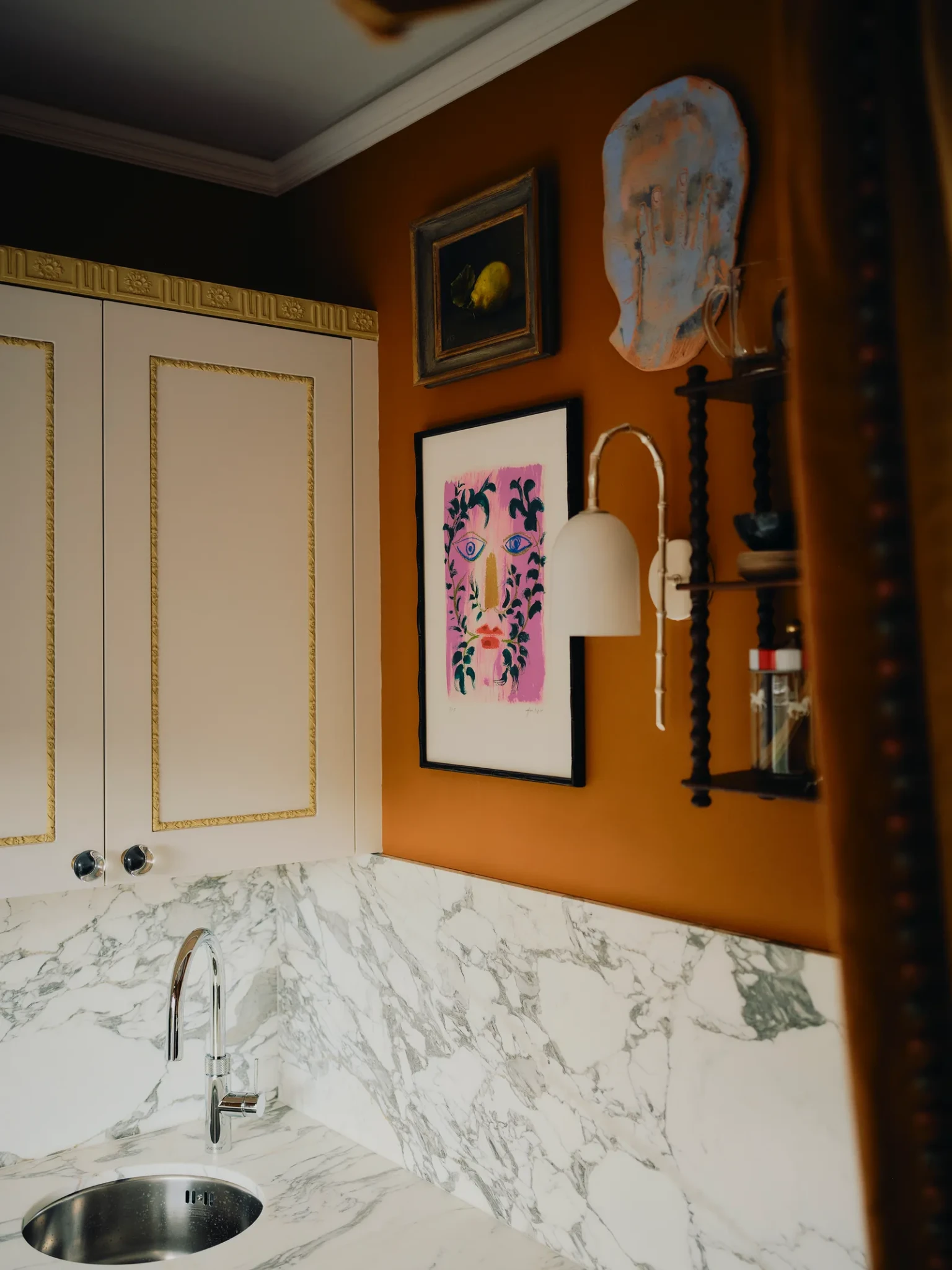 Ταυτόχρονα, τα ιστορικά στοιχεία του κτιρίου, όπως τα γύψινα διακοσμητικά και τα παλιά τζάκια, λειτουργούν ως φόντο για τις πιο σύγχρονες επιλογές. Αυτή η συνύπαρξη παλιού και νέου είναι ένα από τα χαρακτηριστικά που κάνουν το σπίτι τόσο ιδιαίτερο.