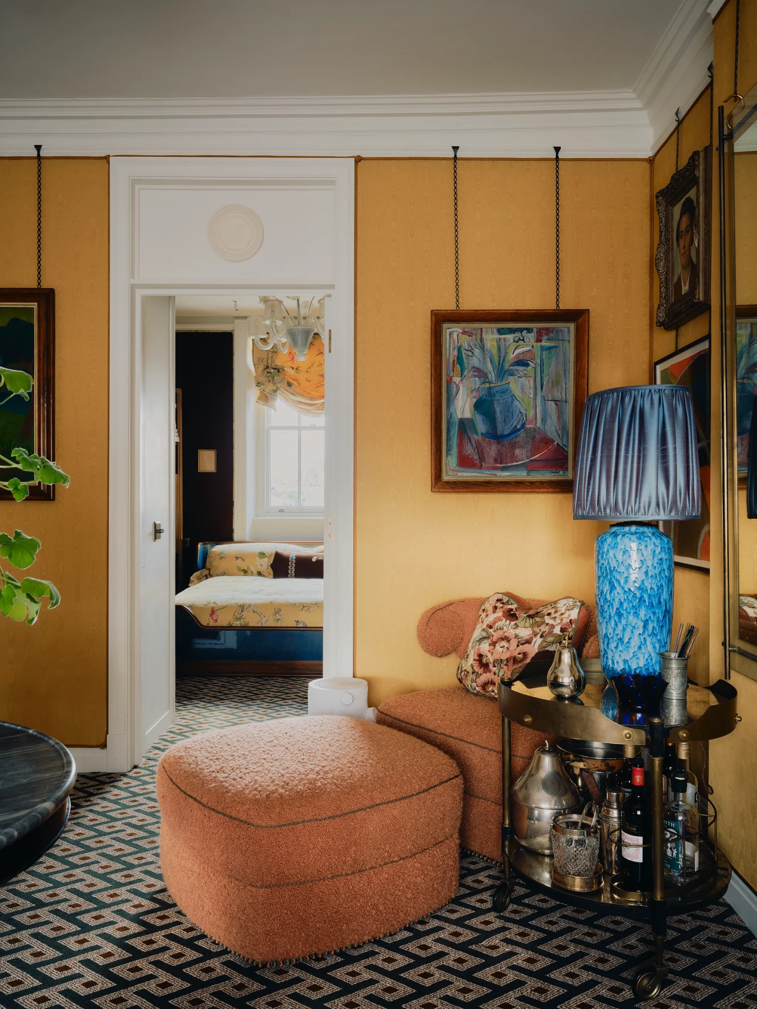 Το σαλόνι είναι ίσως το πιο χαρακτηριστικό παράδειγμα αυτής της προσέγγισης. Μεγάλοι καναπέδες, πολυθρόνες και υποπόδια δημιουργούν μια σύνθεση που ενθαρρύνει την κοινωνικότητα. Ο ίδιος ο Brudnizki έχει δηλώσει ότι ήθελε έναν χώρο όπου πολλοί άνθρωποι μπορούν να καθίσουν, να συζητήσουν και να χαλαρώσουν μαζί. Το αποτέλεσμα είναι ένα δωμάτιο που θυμίζει σαλόνι παλιάς αγγλικής έπαυλης, αλλά με μια πιο παιχνιδιάρικη διάθεση.
