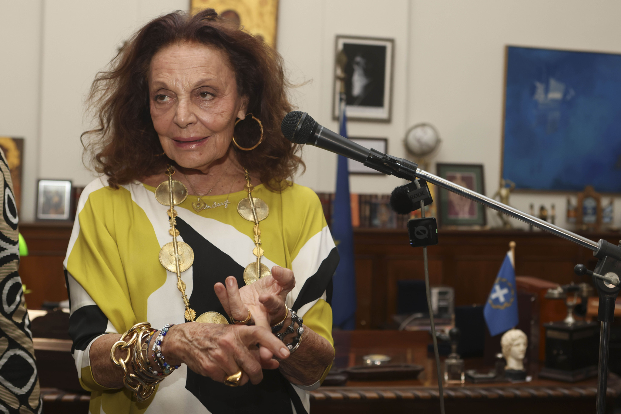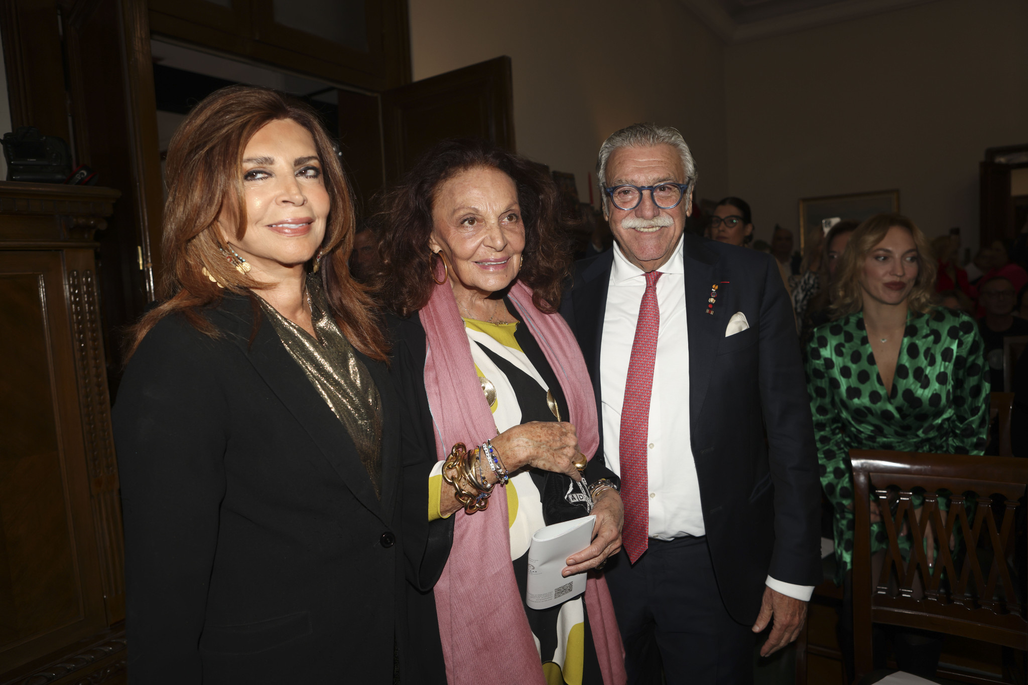 Μετά τους χαιρετισμούς του κ. Γκιουλέκα και της κας Ντενίση, η Diane von Fürstenberg παρέλαβε τη διάκριση εμφανώς συγκινημένη, ευχαριστώντας θερμά για την τιμή και εκφράζοντας τη βαθιά της χαρά που βρέθηκε ξανά στην πόλη από όπου ξεκίνησε η οικογενειακή της ιστορία. Μαζί της βρέθηκε και ο αδελφός της, Philippe Halfin, με τη σύζυγό του Greta, μοιραζόμενοι τη συγκίνηση της στιγμής.