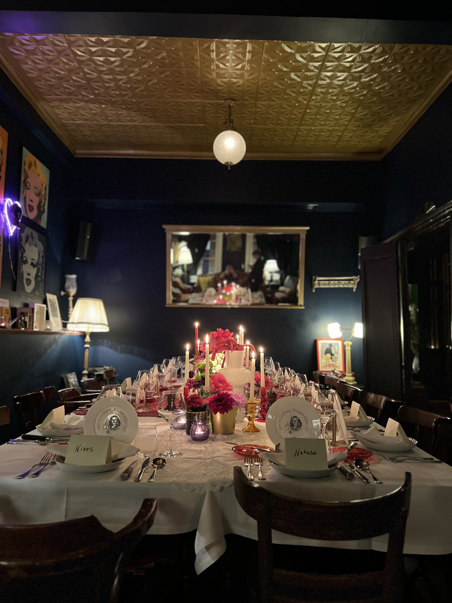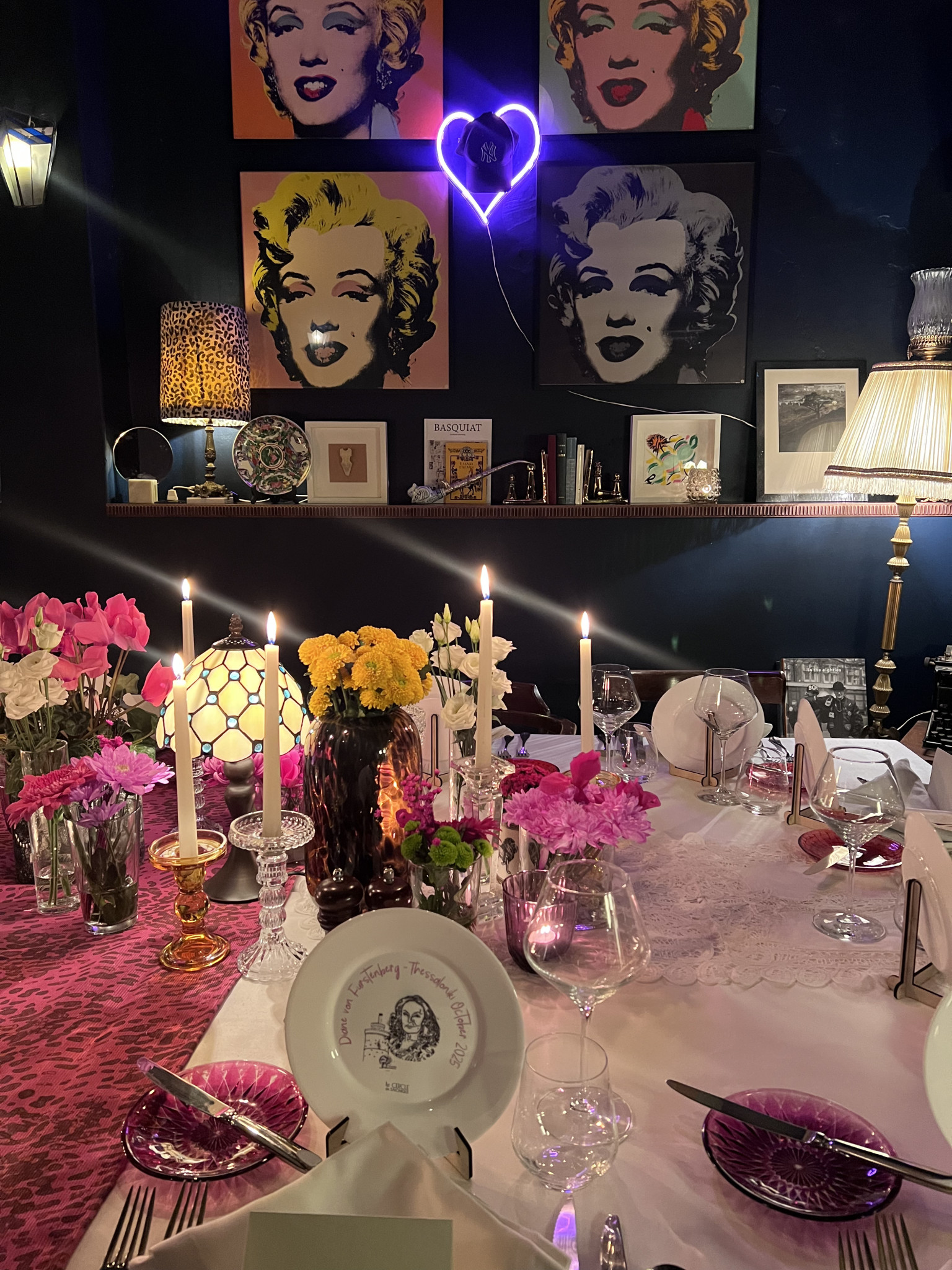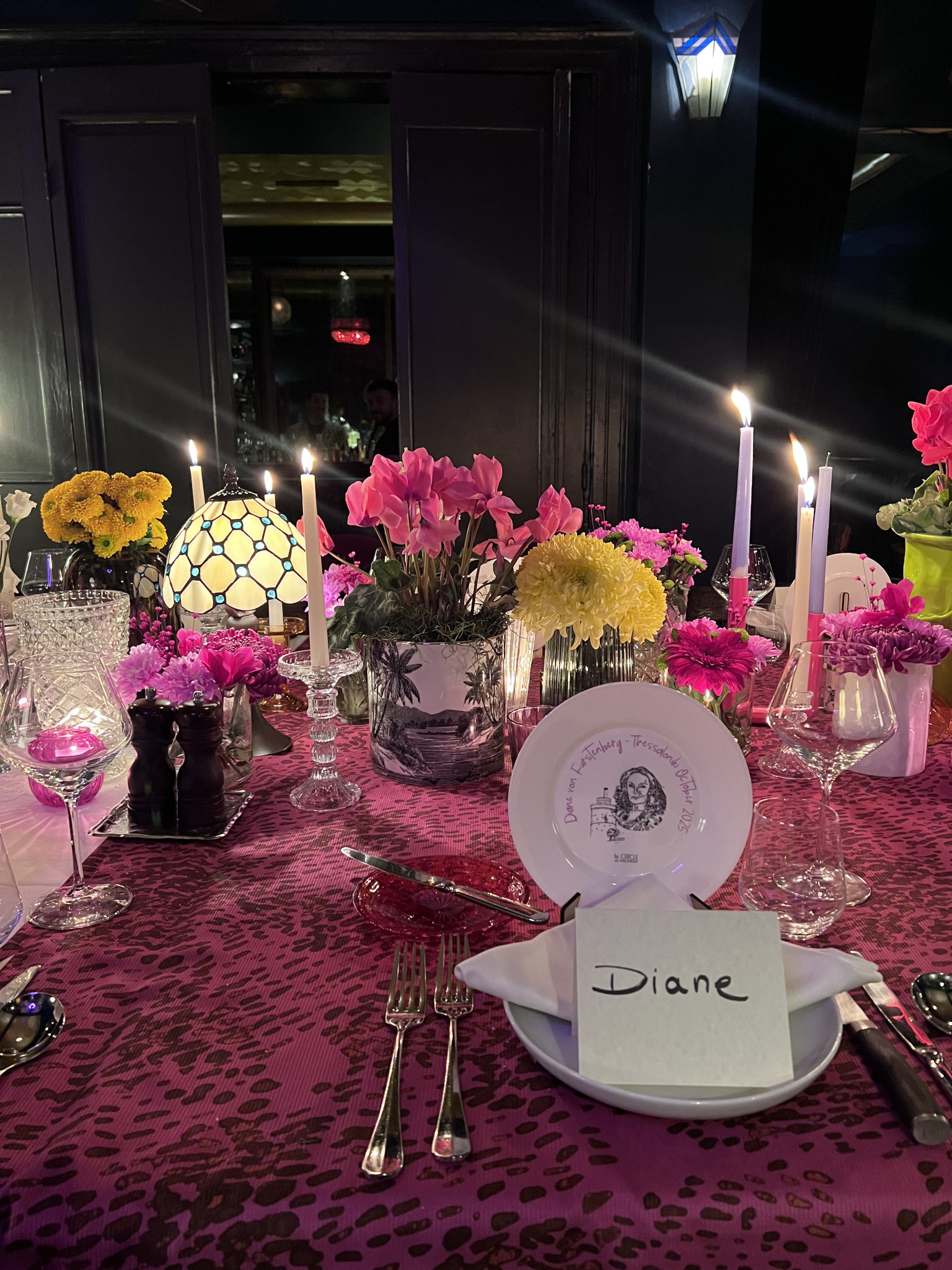 Η διακόσμηση ήταν εμπνευσμένη αποκλειστικά από τη σχεδιάστρια, με art prints και λουλούδια να κυριαρχούν στο σκηνικό, ενώ ξεχώρισε ένα προσωποποιημένο δώρο - ένα χειροποίητο πιάτο διακοσμημένο με το πορτρέτο της Diane von Fürstenberg και το σύμβολο της πόλης, τον Λευκό Πύργο. Το μενού, σχεδιασμένο από τον σεφ Γιάννη Πατεικά, περιλάμβανε αγαπημένες ελληνικές γεύσεις, ενώ τη μουσική της βραδιάς επιμελήθηκε η resident DJ Georgia P.