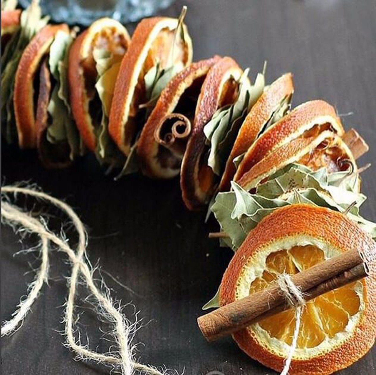 Αποξηράνετε φέτες από πορτοκάλια και περάστε τα από ένα σπάγκο μαζί με δαφνόφυλλα και sticks κανέλας και συνθέστε τη δική σας χριστουγεννιάτικη γιρλάντα.
