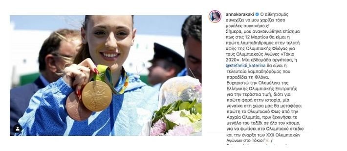 Mε ένα συγκινητικό post στο Instagram η αθλήτρια Άννα Κορακάκη ανακοινώνει ότι θα είναι η πρώτη λαμπαδηδρόμος που θα μεταφέρει τη φλόγα στους Όλυμπιακούς Αγώνες του 2020 στο Τόκιο! H νεαρή ολυμπιονίκης θα είναι η πρώτη γυναίκα στην ιστορία των αγώνων που θα βρεθεί στην τελετή αφής της Ολυμπιακής Φλόγας. Εμείς ευχόμαστε στην Άννα καλή επιτυχία και φυσικά νιώθουμε ακόμη πιο υπερήφανες που θα ζήσουμε αυτή την ιστορική στιγμή. Από την πολιτική σκηνή της χώρας έως και τον χώρο του αθλητισμού φαίνεται ότι το 2020 θα είναι η χρονιά του women empowerment!