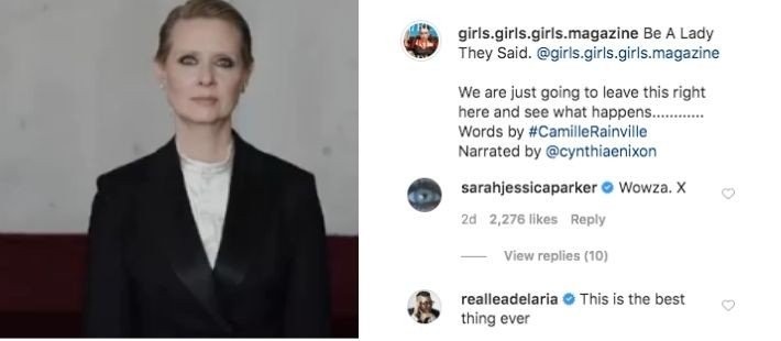 Το video του Girls Girls Girls Magazine με πρωταγωνίστρια την Cynthia Nixon μετράει πλέον πάνω από 2,6 εκατομμύρια views κι έχει κατακλύσει τον κόσμο των social media με γυναίκες κάθε ηλικίας και background να ταυτίζονται απόλυτα. Με τίτλο "Βe a Lady" η αγαπημένη ηθοποιός του Sex and The City και πολιτικός απαριθμεί σε έναν καθηλωτικό μονόλογο τους αμέτρητους περιορισμούς, κοινωνικές απαιτήσεις και στερεότυπα στα οποία πρέπει να αντεπεξέλθουν οι σύγχρονες γυναίκες. "Να είσαι κυρία, είπαν. Η φούστα σου είναι πολύ κοντή. Το πουκάμισό σου πολύ αποκαλυπτικό. Μη δείχνεις τόσο δέρμα. Καλύψου. Άσε και κάτι στη φαντασία. Δείχνε sexy. Μην είσαι τόσο προκλητική." Η λίστα με τα πρέπει και τις υποδείξεις διαρκεί για περισσότερο από 2 λεπτά και ως γυναίκα στο τέλος του βίντεο νιώθεις πραγματικά εξοργισμένη καθώς όλα αυτά τα "πρέπει" τα έχεις ακούσει τουλάχιστον μία φορά στη ζωή σου. Εάν δεν το έχετε δει κάντε το asap! Προσωπικά μου άλλαξε τη ζωή!