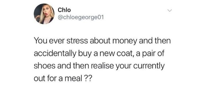 Με αφορμή το τέλος του μήνα ο σαρκαστικός λογαριασμός του Instagram Sarcasm_only μοιράστηκε ένα tweet που λάτρεψαν followers και celebrities. "Έχετε αγχωθεί ποτέ για τα χρήματα που σας έχουν μείνει αλλά μετά αν συνειδητοποιείτε ότι κατά λάθος αγοράσατε ένα καινούριο παλτό, παπούτσια και ότι είστε έξω φαγητό;" το οποίο περιγράφει άψογα την κατάστασή μας κάθε τέλος του μήνα!