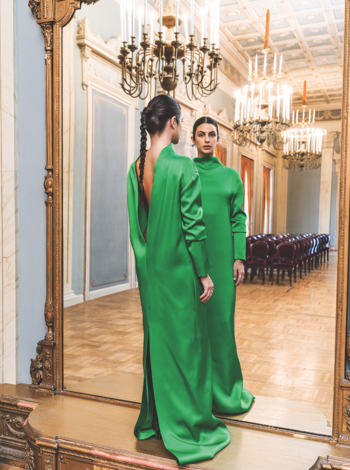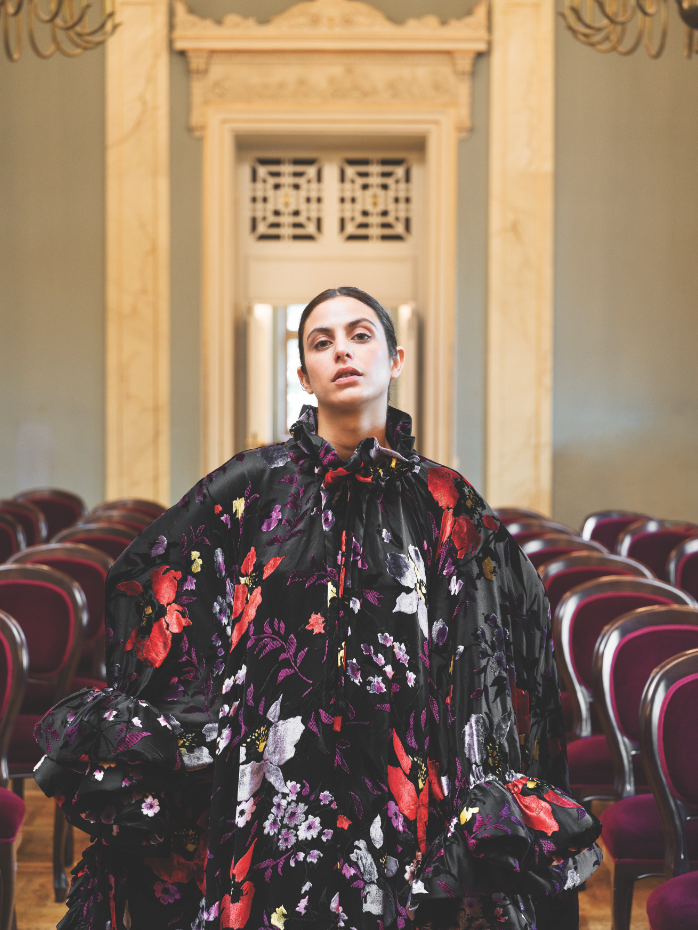 Σακάκι από µαλλί, τοπ και φούστα από ζέρσεϊ κεντηµένα µε κρύσταλλα, όλα Sportmax, Max Mara Boutique Παπούτσια από τούλι κεντηµένα µε παγιέτες Jimmy Choo, Kalogirou