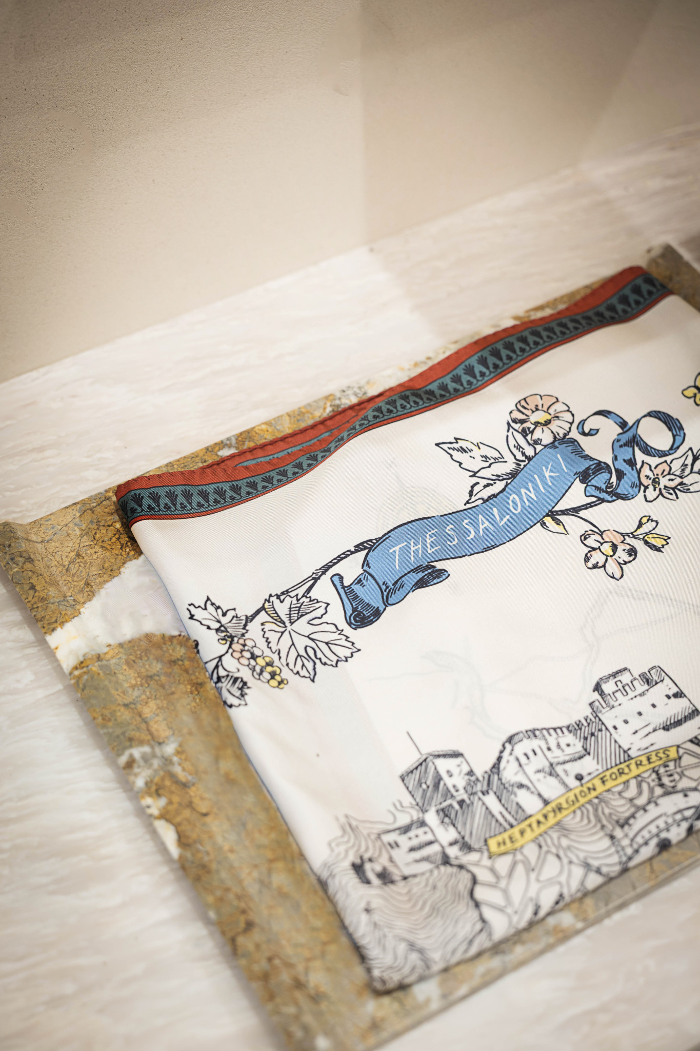 Κεντρικό σημείο της παρουσίασης αποτέλεσε το μεταξωτό μαντήλι “Thessaloniki”, μια συλλεκτική δημιουργία αφιερωμένη στην πόλη. Μέσα από ένα τρίλεπτο animated video, η Zeus+Δione μετέτρεψε την αφήγηση της Θεσσαλονίκης σε ένα εικαστικό ταξίδι. Σχεδιασμένο από την καλλιτέχνιδα Em Prové σε συνεργασία με τον Marios Schwab, το συλλεκτικό μαντήλι «ξεδιπλώνει» το ένδοξο παρελθόν της πόλης, αναδεικνύοντας τα ιστορικά της τοπόσημα και μετατρέπεται σε έναν καλλιτεχνικό χάρτη, όπου συνυπάρχουν οι πολιτισμικές στρώσεις της συμπρωτεύουσας. Σαν ένα μικρό κειμήλιο από μετάξι, το μαντήλι επισφραγίζει τον δεσμό του fashion label με τη Θεσσαλονίκη, από τώρα και για πάντα.