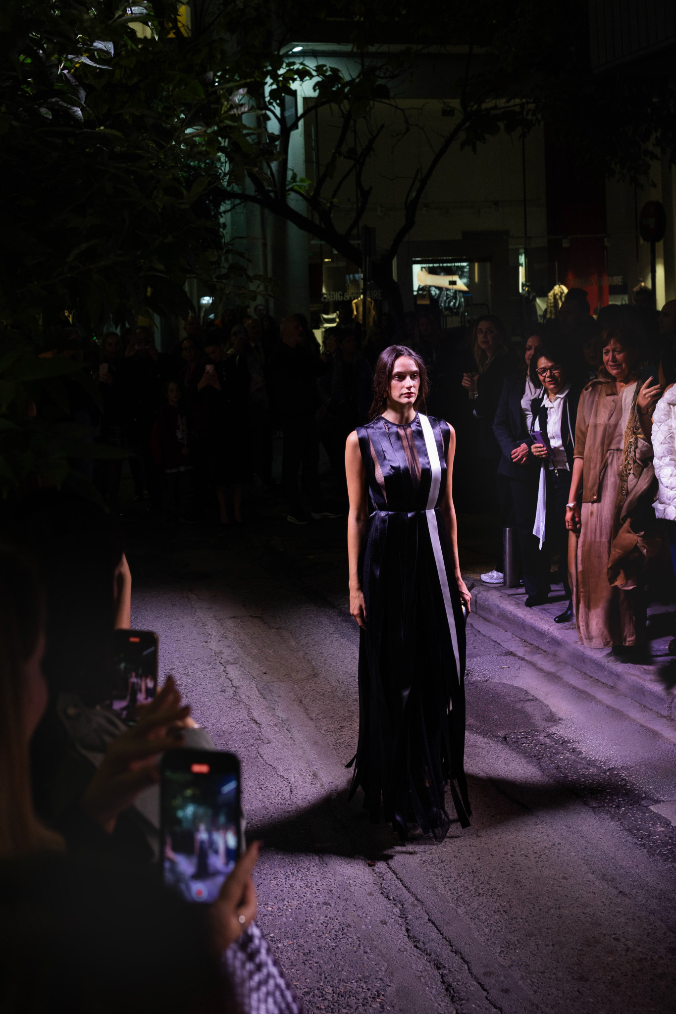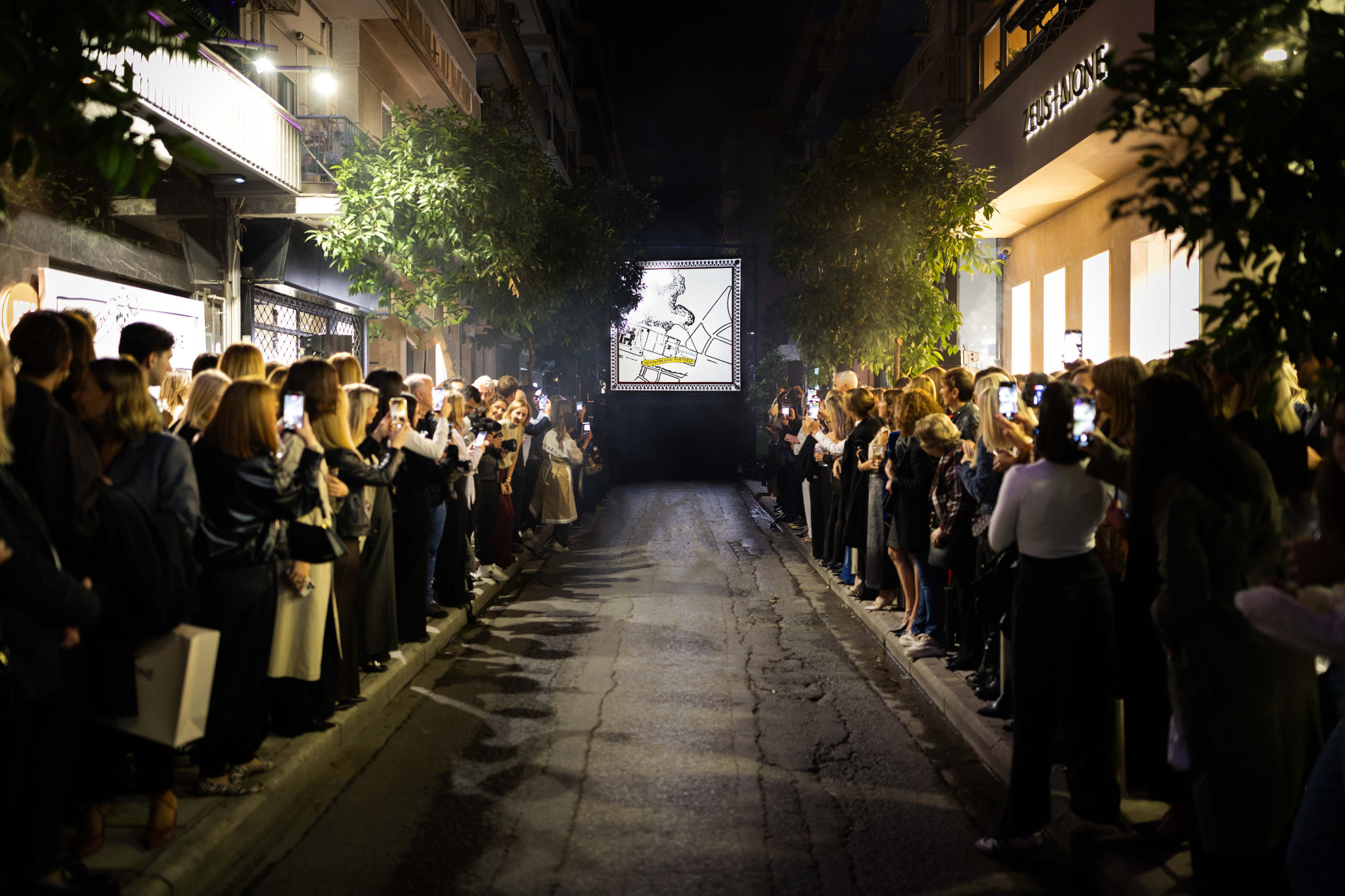Η αφήγηση συνεχίστηκε ζωντανά στον χώρο των εγκαινίων, όπου τα μοτίβα του μαντηλιού πήραν φυσική μορφή. Μουσικά όργανα που απεικονίζονταν στο μετάξι εμφανίστηκαν στο σκηνικό, με τους ήχους ενός ακορντεόν να δίνουν το έναυσμα για ένα mini catwalk της συλλογής “Chimera” Φθινόπωρο/Χειμώνας 2025, σε καλλιτεχνική επιμέλεια του Marios Schwab. Λίγο αργότερα, μια λατέρνα πλημμύρισε τον χώρο με τη νοσταλγική της μελωδία, χαρίζοντας στην παρουσίαση μια ποιητική, πολυαισθητηριακή διάσταση.