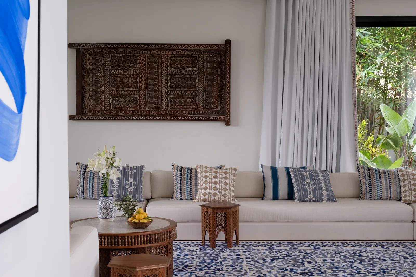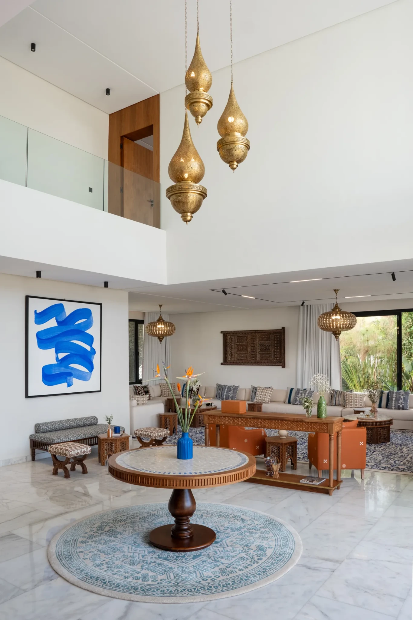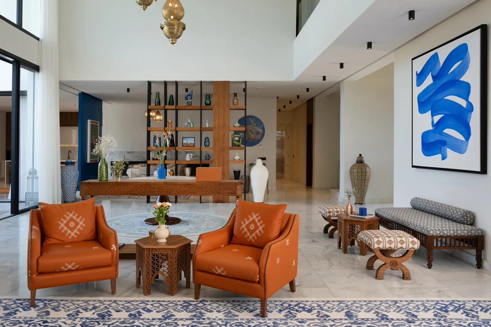 Η χρωματική παλέτα της βίλας παραπέμπει στη γη και το φως της Μαρόκου: ζεστή τερακότα, αμμώδεις τόνοι και απαλή ώχρα δημιουργούν ένα ήρεμο υπόβαθρο, ενώ το έντονο Majorelle blue εμφανίζεται σε υφάσματα, κεραμικά και έργα τέχνης, προσφέροντας ζωντάνια και αντίθεση χωρίς να υπερβαίνει τη συνοχή του χώρου.