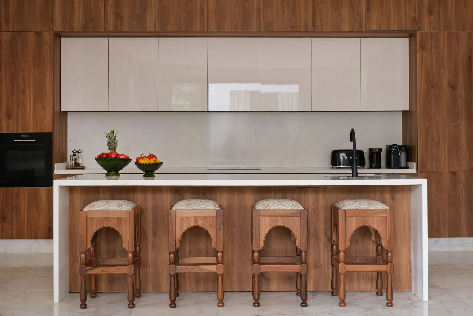 Οι χώροι κοινωνικής συναναστροφής είναι μεγάλοι, ζεστοί και φιλόξενοι, με βυθισμένα καθιστικά που ενθαρρύνουν τις συζητήσεις και τη διασκέδαση. Αντίστοιχα, οι πιο ήσυχες γωνιές έχουν σχεδιαστεί με λιτές γραμμές, περιορισμένα οπτικά ερεθίσματα και γήινες αποχρώσεις, προσφέροντας ιδιωτικότητα και γαλήνη. Αυτή η αντίθεση μεταξύ δυναμικών και ήσυχων χώρων επιτρέπει στο σπίτι να προσαρμόζεται στις ανάγκες της οικογένειας και των επισκεπτών, από μεγάλες γιορτές μέχρι ήσυχες στιγμές ανάπαυλας.