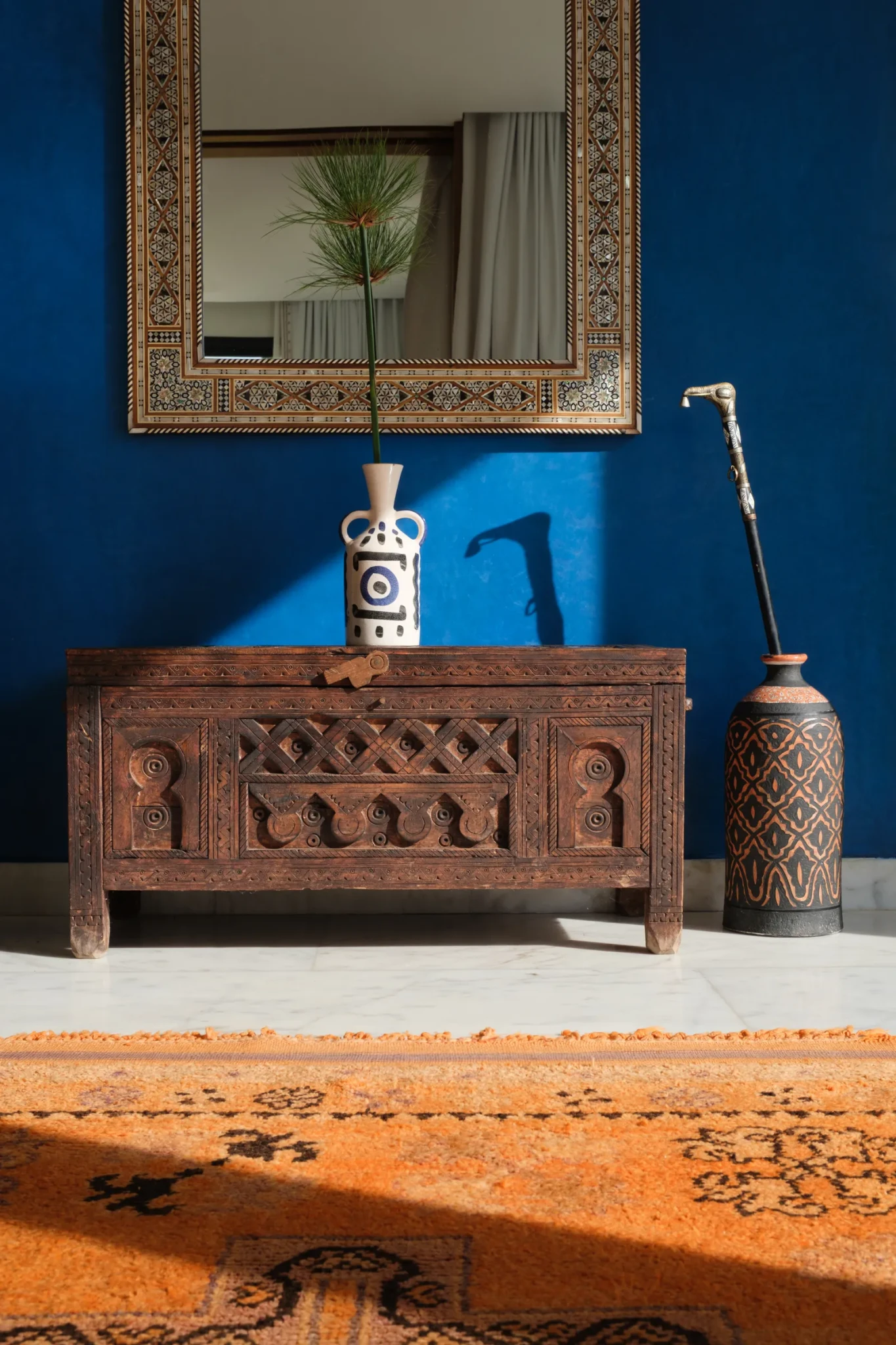 Η Dar Mira είναι αποτέλεσμα συνεργασίας με πολλούς τοπικούς τεχνίτες, που ανέλαβαν την κατασκευή επίπλων, υφασμάτων και διακοσμητικών στοιχείων. Τα αυθεντικά zellige πλακίδια από τη Φεζ κοσμούν το υπαίθριο τζάκι, ενώ φανάρια από σφυρήλατο ορείχαλκο θα αποκτήσουν φυσική πατίνα με το χρόνο, ενισχύοντας την αίσθηση της διαχρονικότητας. Στην τραπεζαρία, ένα ειδικά κατασκευασμένο έπιπλο από εργαστήριο στην Καζαμπλάνκα συνοδεύεται από πολύχρωμα χαλιά από τη Ραμπάτ, ενώ ένα ξύλινο σκαλιστό πάνελ στο καθιστικό προσθέτει χαρακτήρα και παραστατικότητα στους χώρους.