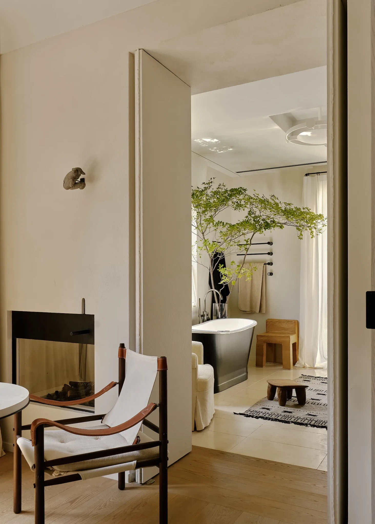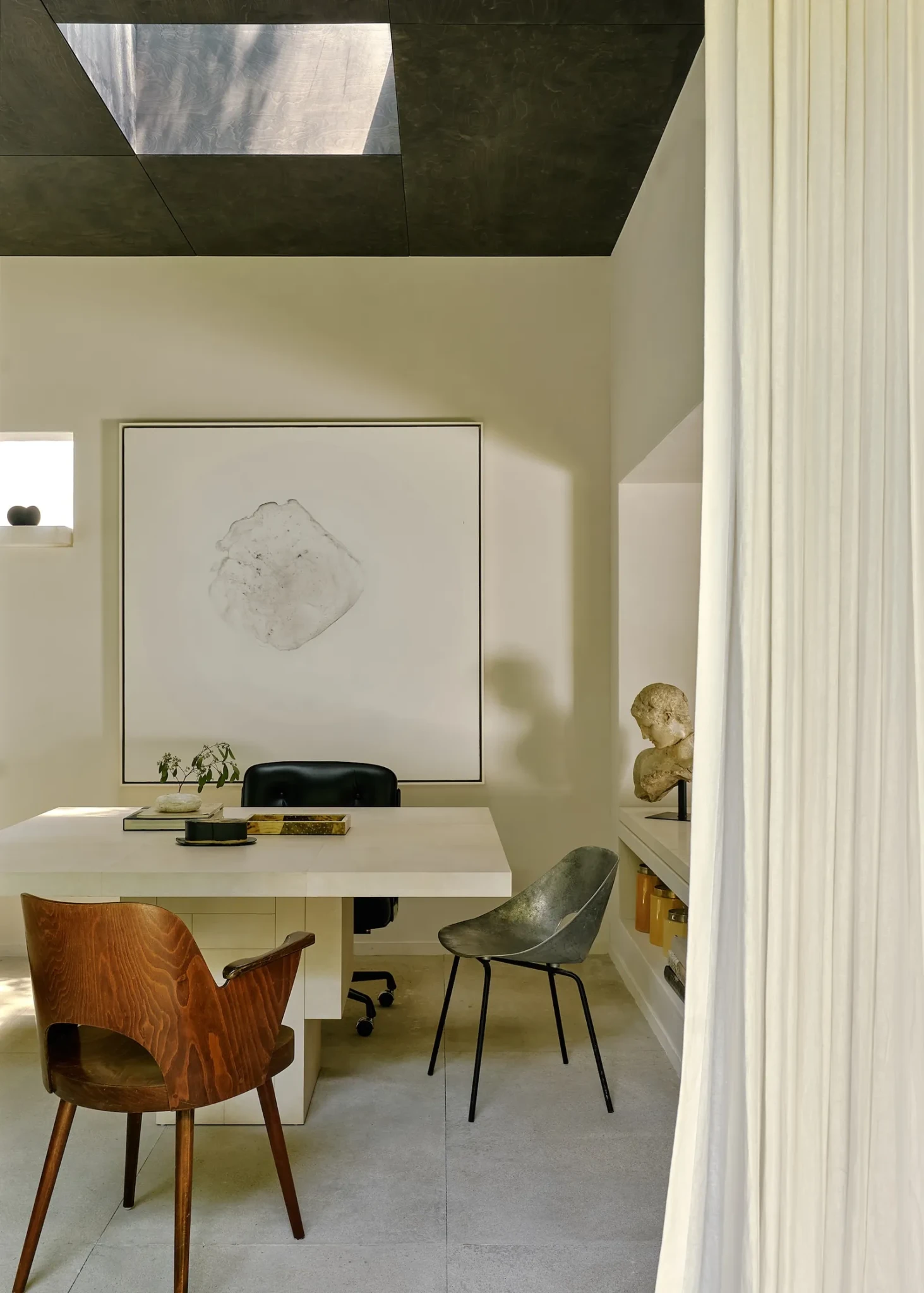 Παρόλο που στο εσωτερικό δεν υπάρχουν εμφανή ανατολικά σύμβολα, η φιλοσοφία της Ανατολής διαπερνά κάθε λεπτομέρεια. Οι φυσικές και ακατέργαστες υφές —οι τοίχοι χωρίς επεξεργασία, τα ξύλινα δάπεδα, η πέτρινη νησίδα στην κουζίνα— αποπνέουν απλότητα και αυθεντικότητα. Το φως και η σκιά λειτουργούν σαν ζωντανά στοιχεία, μεταμορφώνοντας τον χώρο ανάλογα με την ώρα της ημέρας. Ακόμη και οι πέτρες τοποθετημένες στον μικρό εσωτερικό κήπο παραπέμπουν στη φιλοσοφία του wabi-sabi, που υμνεί την ομορφιά της ατέλειας και του χρόνου.