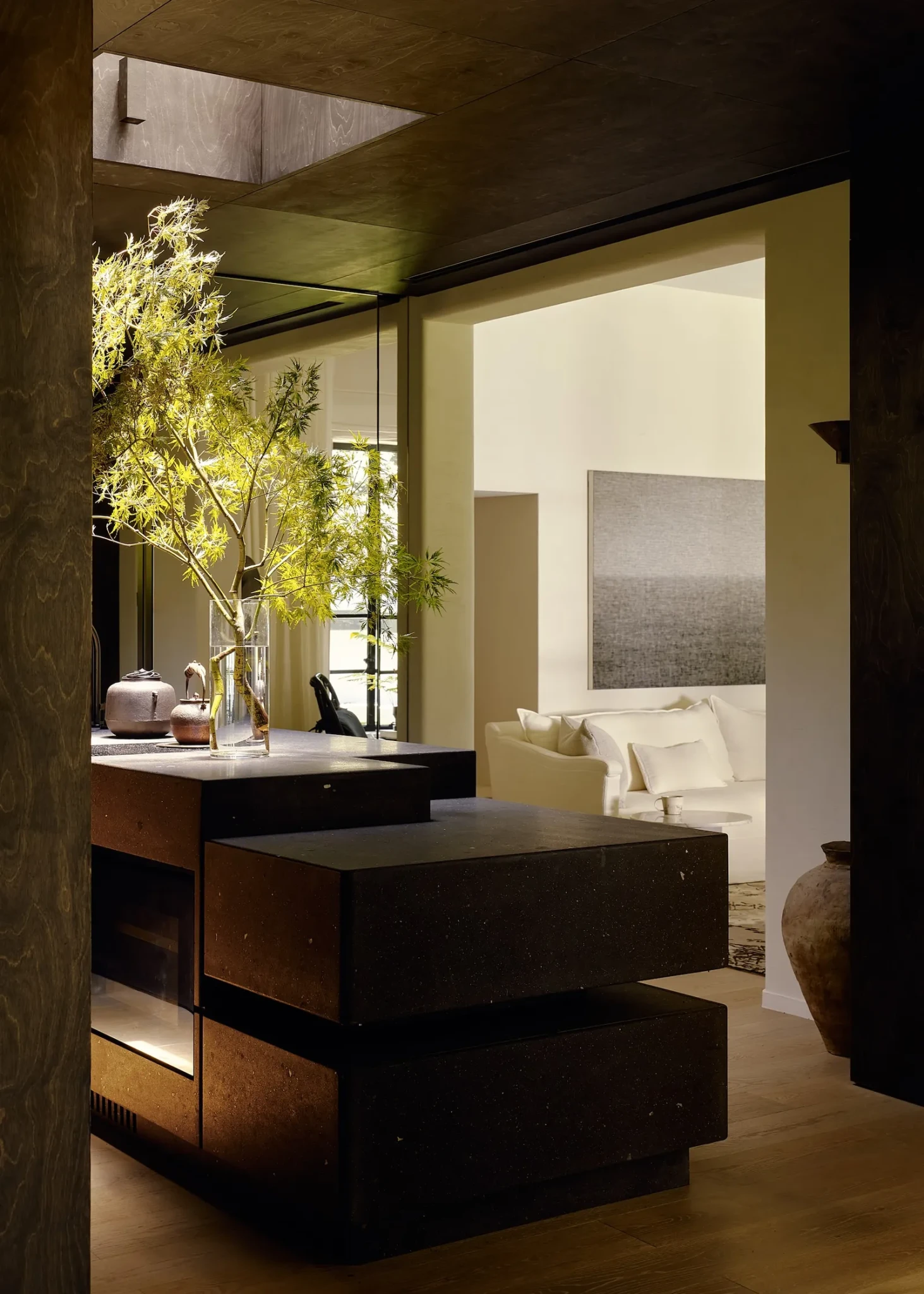 Όταν ο ήλιος δύει και η πόλη φωτίζεται τεχνητά, το εσωτερικό της κατοικίας γεμίζει με τη θερμότητα της φλόγας. Οι εστίες - τοποθετημένες σε διαφορετικά σημεία, από το σαλόνι και τα υπνοδωμάτια μέχρι τον εξωτερικό κήπο - λειτουργούν σαν δεύτερη πηγή φωτός και ενέργειας. Το στοιχείο της φωτιάς φέρνει ζωή και θαλπωρή, μεταμορφώνοντας τη νυχτερινή ατμόσφαιρα του σπιτιού σε σκηνή οικειότητας και συντροφικότητας.