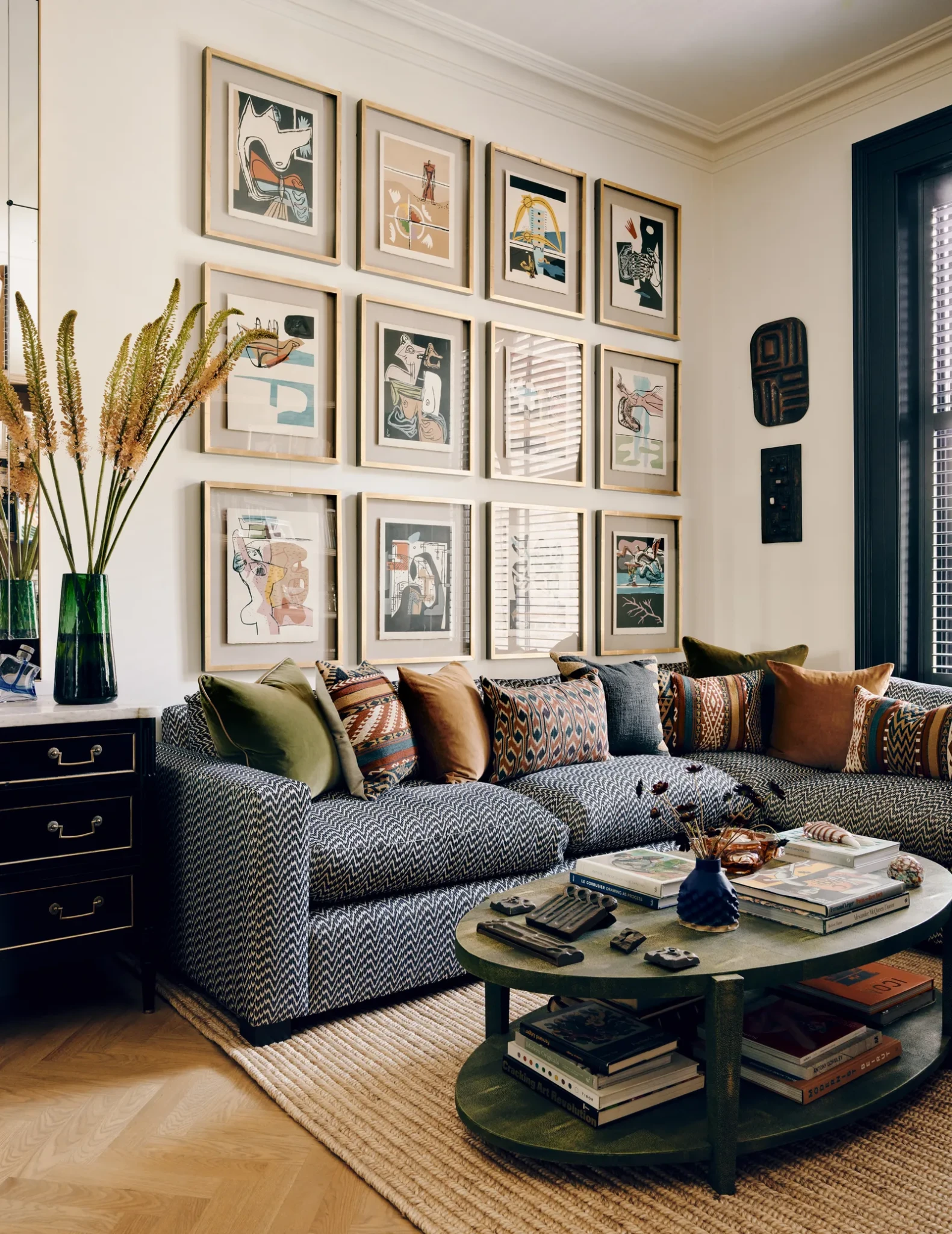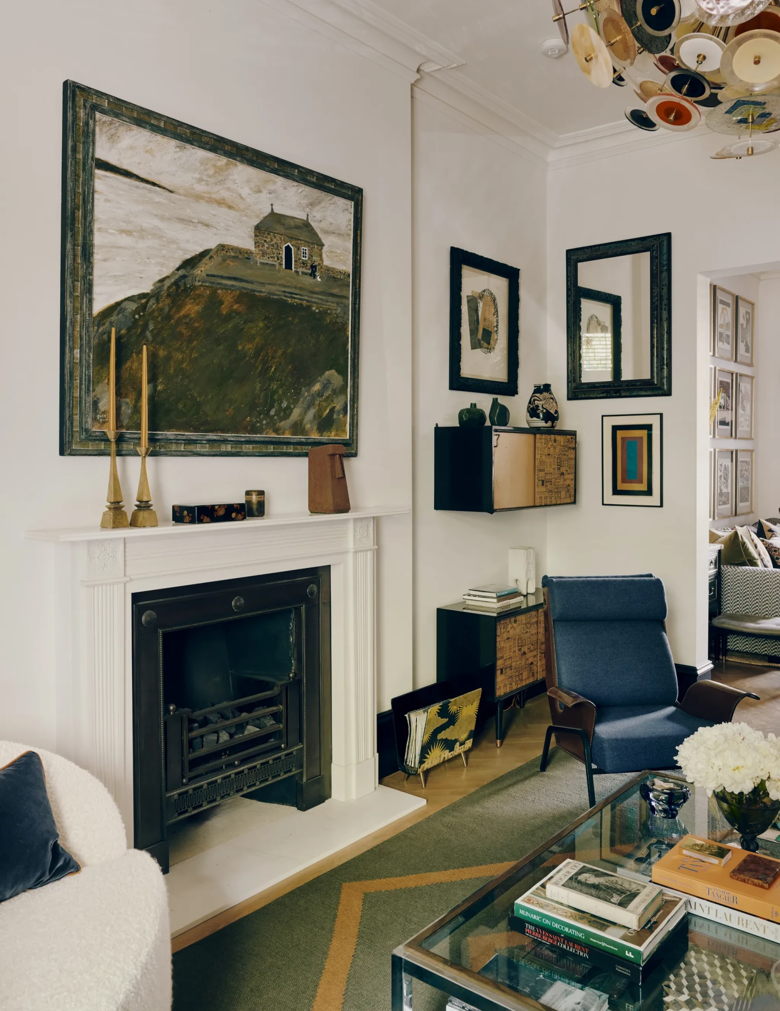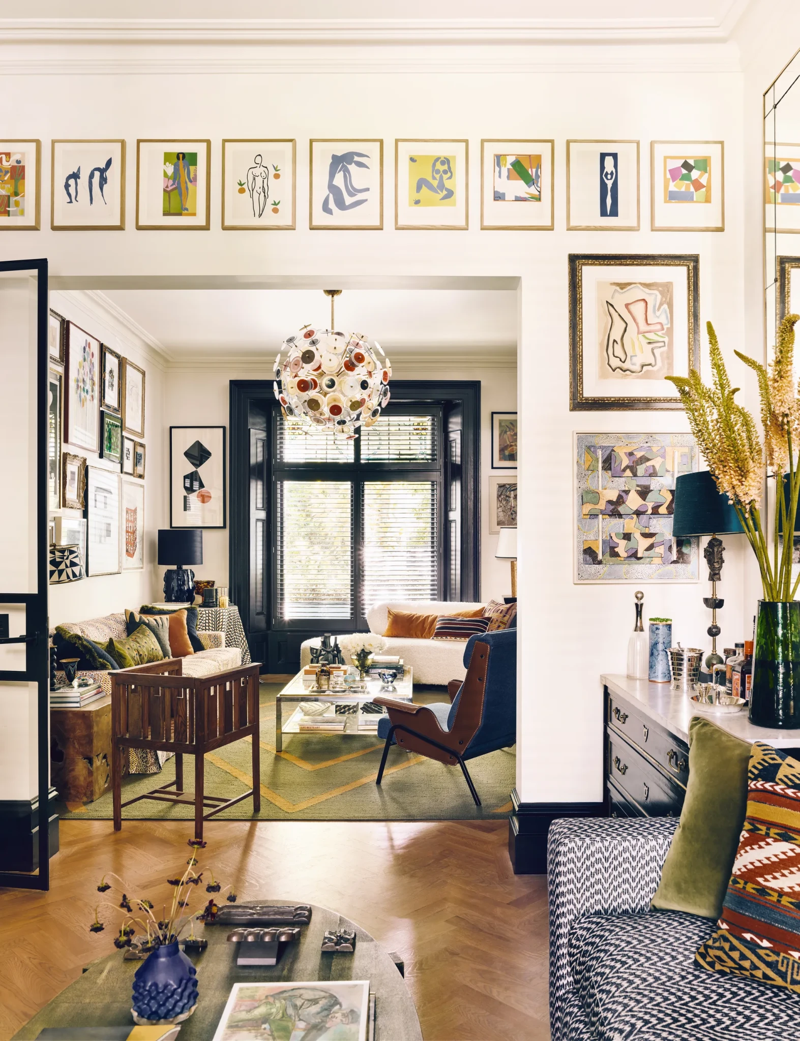 Στο κεντρικό καθιστικό, ο καναπές με ύφασμα Adam Bray λειτουργεί ως επίκεντρο ανάμεσα σε έναν πλούτο ζωγραφικών έργων από καλλιτέχνες όπως ο David Hockney και ο Raoul Dufy. Ο χώρος ισορροπεί ανάμεσα στην κομψότητα και την άνεση, αψηφώντας την τυπική επίσημη αισθητική, και δημιουργεί μια ατμόσφαιρα που είναι ταυτόχρονα πλούσια και οικεία.