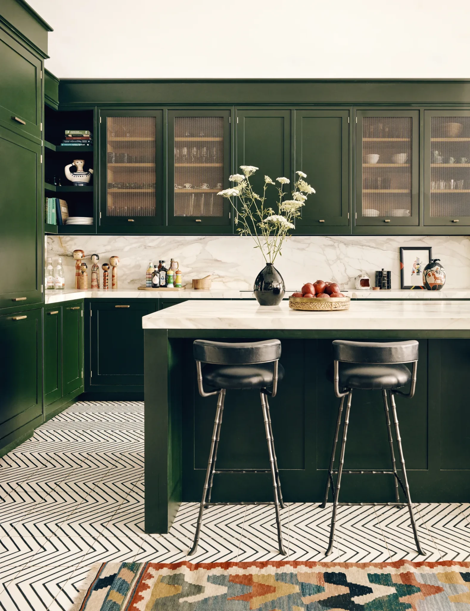 Η ευρύχωρη κουζίνα και η τραπεζαρία έχουν σχεδιαστεί για να βλέπουν απευθείας προς τον κήπο, ενισχύοντας την αίσθηση ενότητας του εσωτερικού με το εξωτερικό. Οι μαρμάρινοι πάγκοι από την Euromarble δημιουργούν μια αίσθηση υπερπολυτελούς υφής και έρχονται σε πλήρη αρμονία με τα ντουλάπια απόχρωσης “Stable Green” από την Paint & Paper Library. Τα δερμάτινα και μπρονζέ σκαμπό του μπαρ είναι από τη Rose Uniacke και προσθέτουν ένα στοιχείο μοντέρνας κομψότητας.