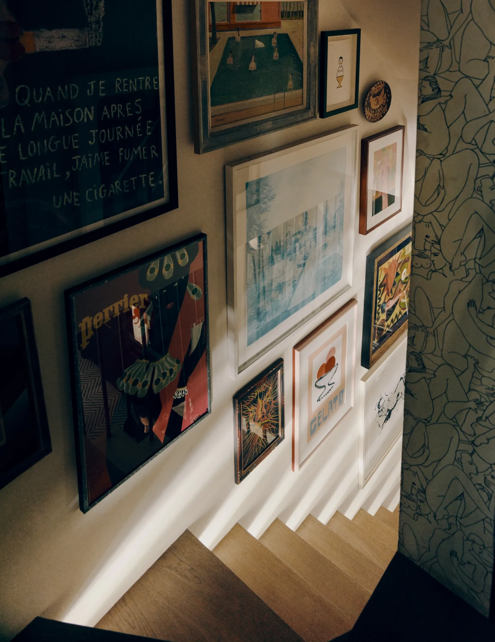 Αυτό που κάνει τη μεζονέτα μοναδική είναι η έντονη παρουσία έργων τέχνης και τα συλλεκτικά έπιπλα. Στους τοίχους της σκάλας δεσπόζουν έργα του Fergus Hilton, ενώ στον καθιστικό χώρο βρίσκονται λιθογραφίες του Matisse και μια σειρά από σημαντικά έργα του Le Corbusier, αντικείμενα που έχουν προσωπική σημασία για τον ιδιοκτήτη.