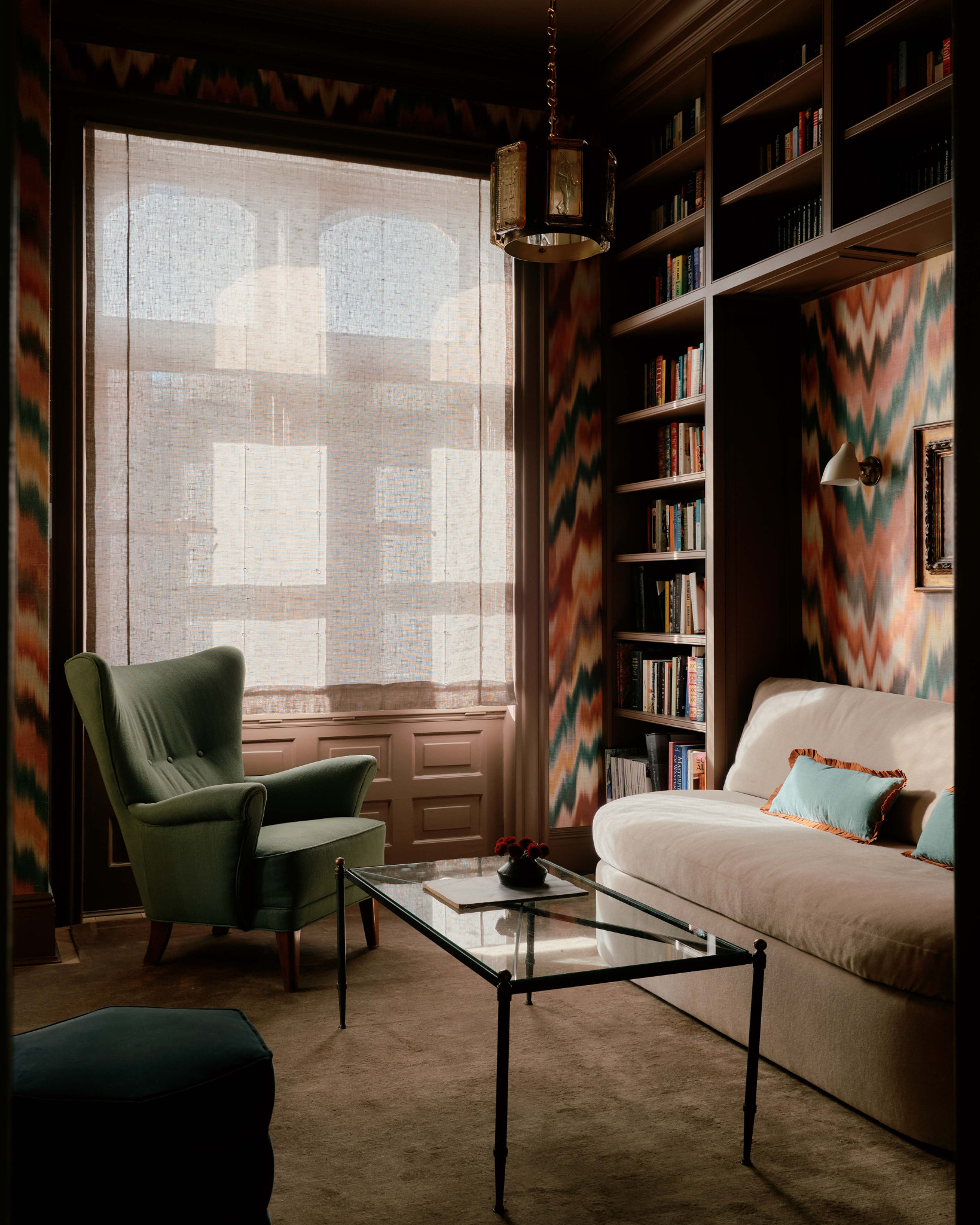 Η ταπετσαρία του γραφείου περιέχει λίγο από το σμαραγδί χρώμα της τραπεζαρίας, ενώ το cozy και ζεστό σαλόνι έρχεται σε αντίθεση με αυτήν. Τα υπνοδωμάτια που βρίσκονται στον επάνω όροφο κυμαίνονται σε επίσης ζεστούς τόνους με βοήθεια από τα αντικείμενα που τα κοσμούν, όπως για παράδειγμα μια σμαραγδένια πολυθρόνα.