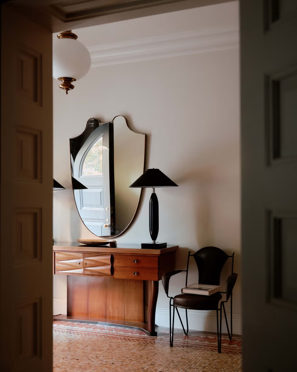 Με το ρολόι να χτυπάει όλο και πιο γρήγορα, η Chused ανέλαβε να ψάξει κι έπειτα να παραγγείλει εκ των προτέρων τα έπιπλα που θα έντυναν τους χώρους τους σπιτιού. Η έκπληξη με την οποία ήρθαν αντιμέτωποι οι συνεργάτες της ήταν το υπέροχο και καλοδιατηρημένο μωσαϊκό που κρυβόταν για χρόνια κάτω από τις ξύλινες σανίδες της εισόδου και όπως είπε και η ίδια η designer «Ήταν ήδη εκεί από την αρχική κατασκευή, το γυαλίσαμε και είναι πανέμορφο». Το καλύτερο κομμάτι της παραπάνω έκπληξης ήταν πως τα περισσότερα έπιπλα που είχαν ήδη διαλεχτεί -κυρίως ιταλικές αντίκες- ταίριαζαν απόλυτα με το μωσαϊκό.