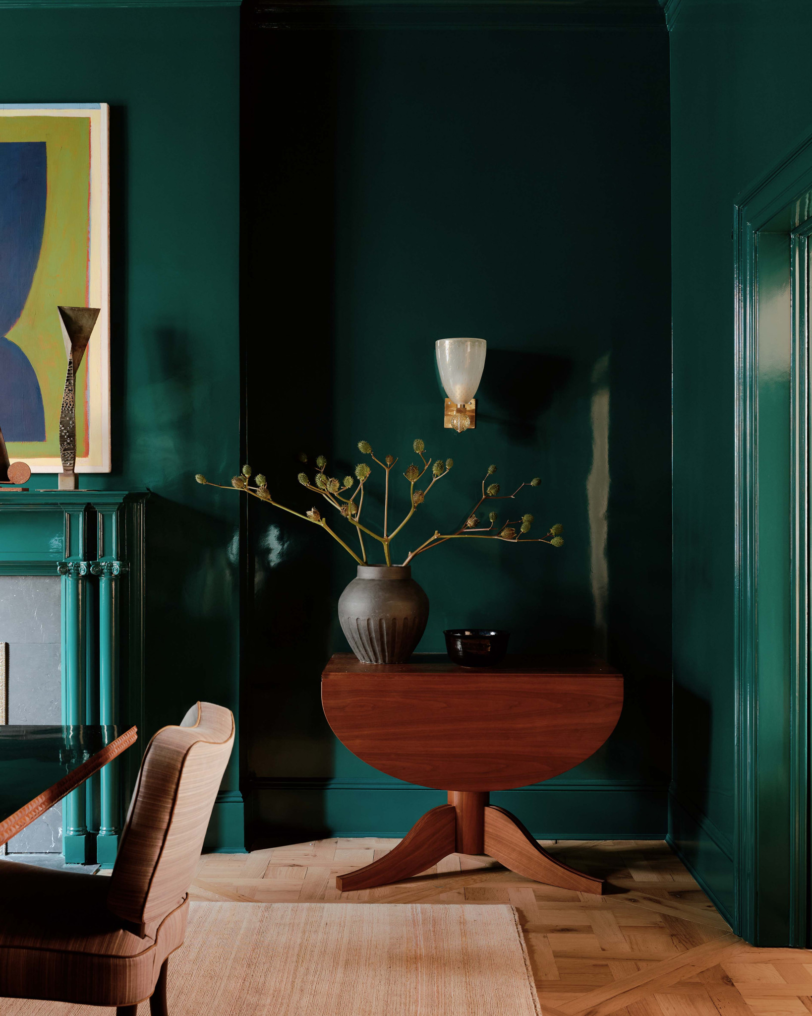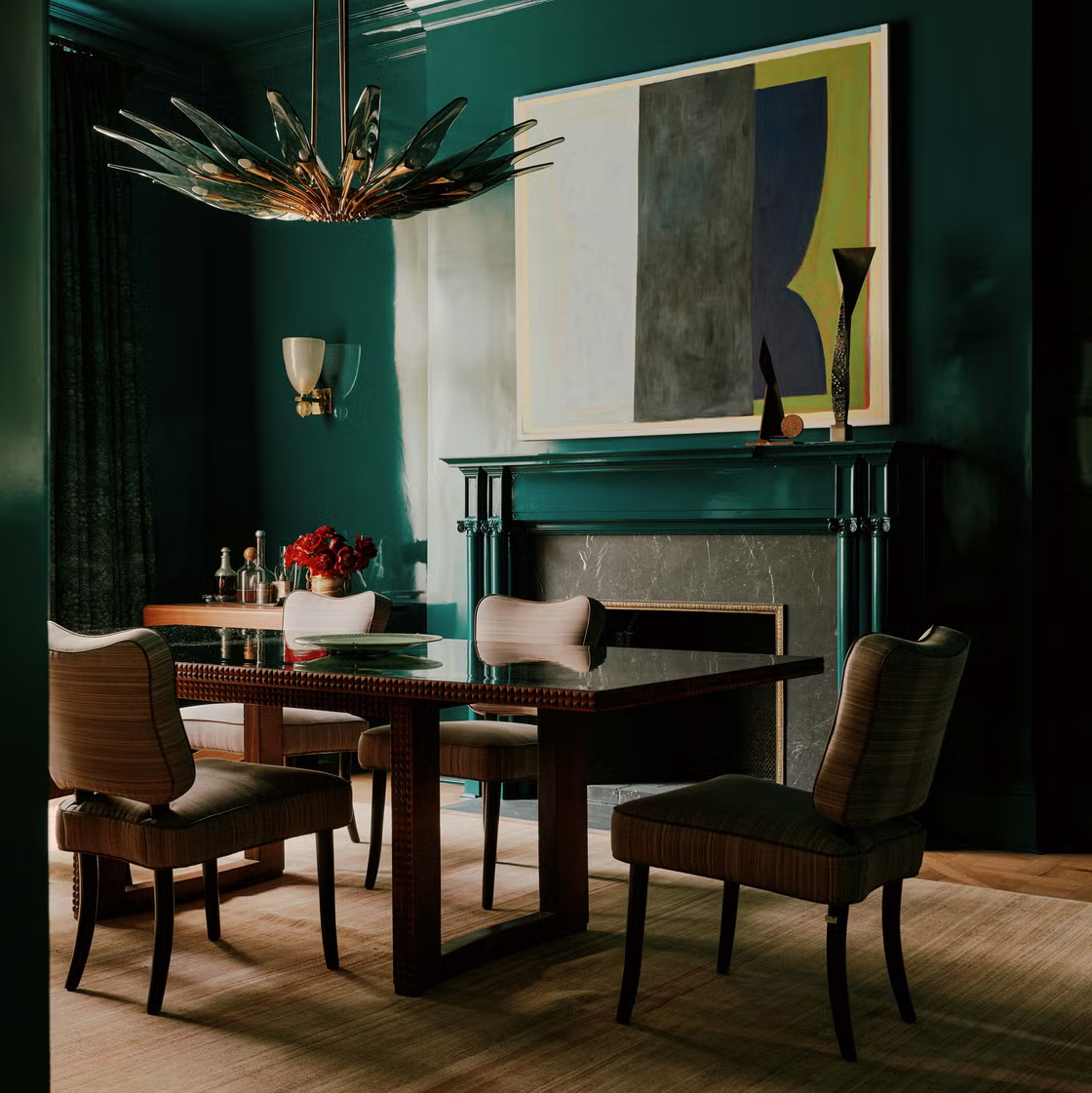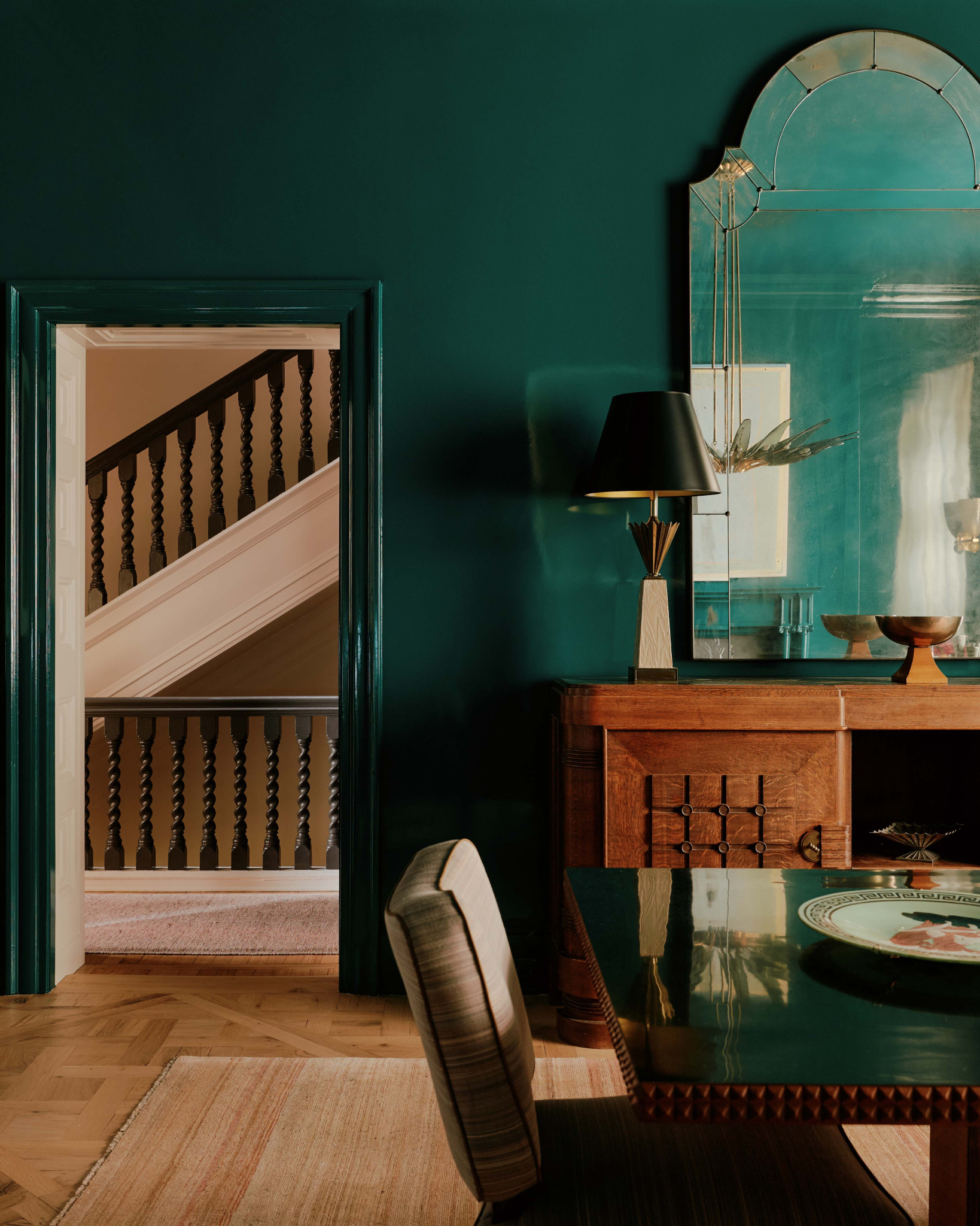 Καθώς η τραπεζαρία αποτελεί το «αστέρι του σπιτιού». οι τοίχοι της ντύθηκαν με ένα σμαραγδί πράσινο χρώμα που έδωσε χαρακτήρα σε όλο το υπόλοιπο σπίτι και συνεπώς όλα τα υπόλοιπα δωμάτια εναρμονίζονται με αυτήν.