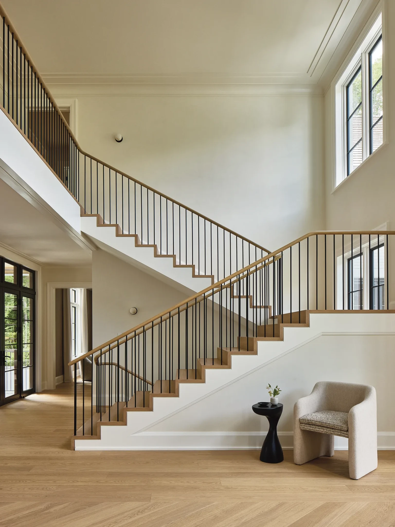 Η προσαρμοσμένη επιπλοποιία και τα έπιπλα κατά παραγγελία ενισχύουν τον «ραμμένο στα μέτρα» χαρακτήρα του σπιτιού. Η εντυπωσιακή είσοδος, με τη διπλού ύψους οροφή και τη σκάλα από δρυ και σίδηρο, λειτουργεί ως μεγαλοπρεπής εισαγωγή στον χώρο. Στο καθιστικό, οι μεγάλες γυάλινες επιφάνειες πλημμυρίζουν το δωμάτιο με φυσικό φως, ενώ η λιτή διακόσμηση αναδεικνύει επιλεγμένα έργα τέχνης και υλικά υψηλής ποιότητας.