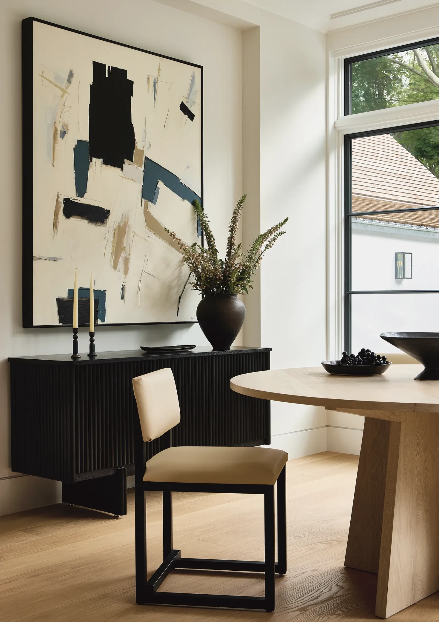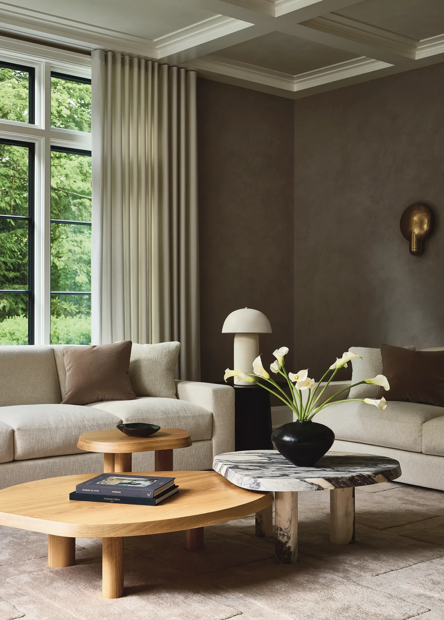 Η εσωτερική αρχιτεκτονική λειτουργεί ως καμβάς για την ανάπτυξη του σχεδιασμού. Φαρδιά ανοίγματα επενδυμένα με λευκή δρυ συνδέουν τους χώρους μεταξύ τους, ενώ η ξύλινη επένδυση προσθέτει ζεστασιά στην κατά βάση ιβουάρ παλέτα. Οι τοίχοι, βαμμένοι με ασβεστοχρώματα σε απαλούς τόνους, αντανακλούν το φως και προσδίδουν μια ήρεμη λάμψη, ενώ οι επιφάνειες με βενετσιάνικο σοβά ενισχύουν την αίσθηση χειροποίητης ποιότητας.