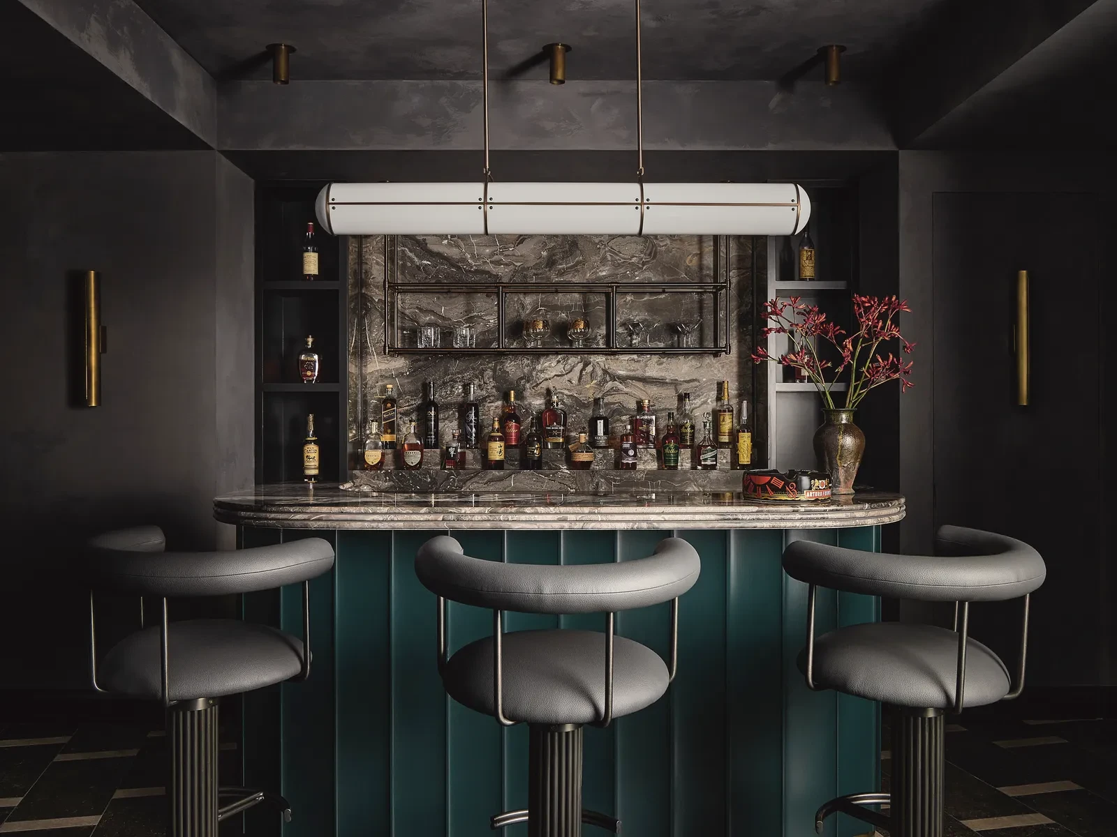 Ιδιαίτερη μνεία αξίζει στο κομψά κρυμμένο bar, το οποίο αποκαλύπτεται μόνο όταν ανοίξουν οι επενδύσεις του τοίχου, καθώς και στους πιο ιδιωτικούς χώρους, όπως το γραφείο και η τραπεζαρία, που αποπνέουν ζεστασιά και οικειότητα. Το υπόγειο επίπεδο ολοκληρώνει την εμπειρία, φιλοξενώντας χώρους άσκησης, χαλάρωσης και κοινωνικής συναναστροφής, σχεδιασμένους για όλες τις ηλικίες.