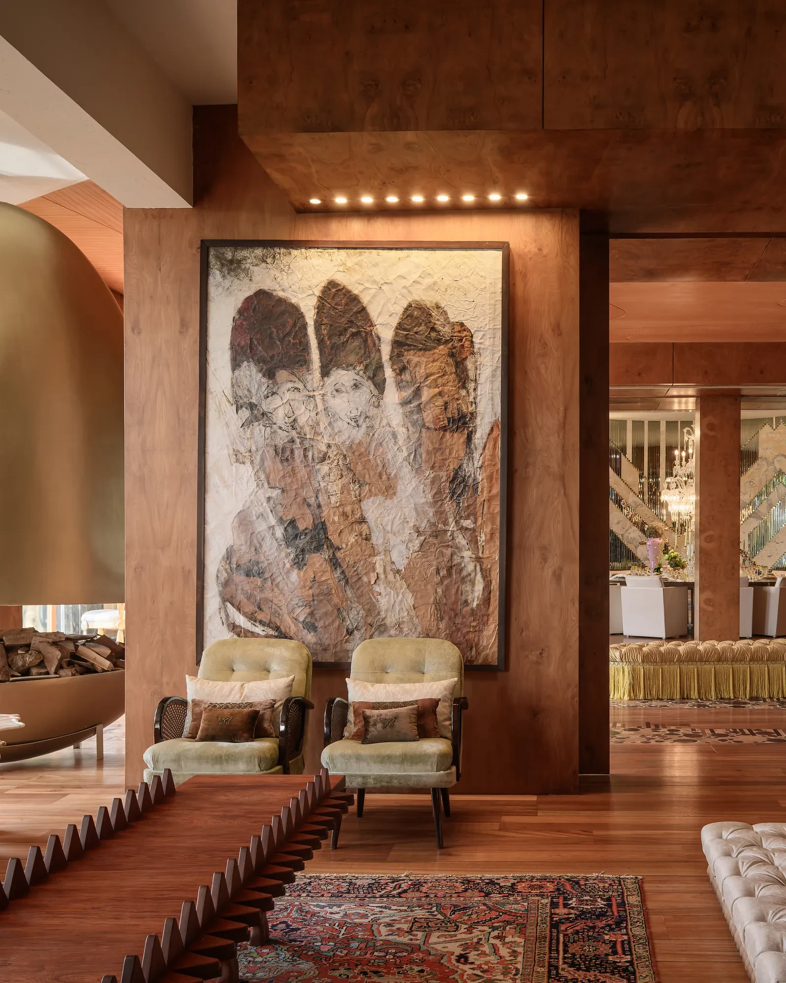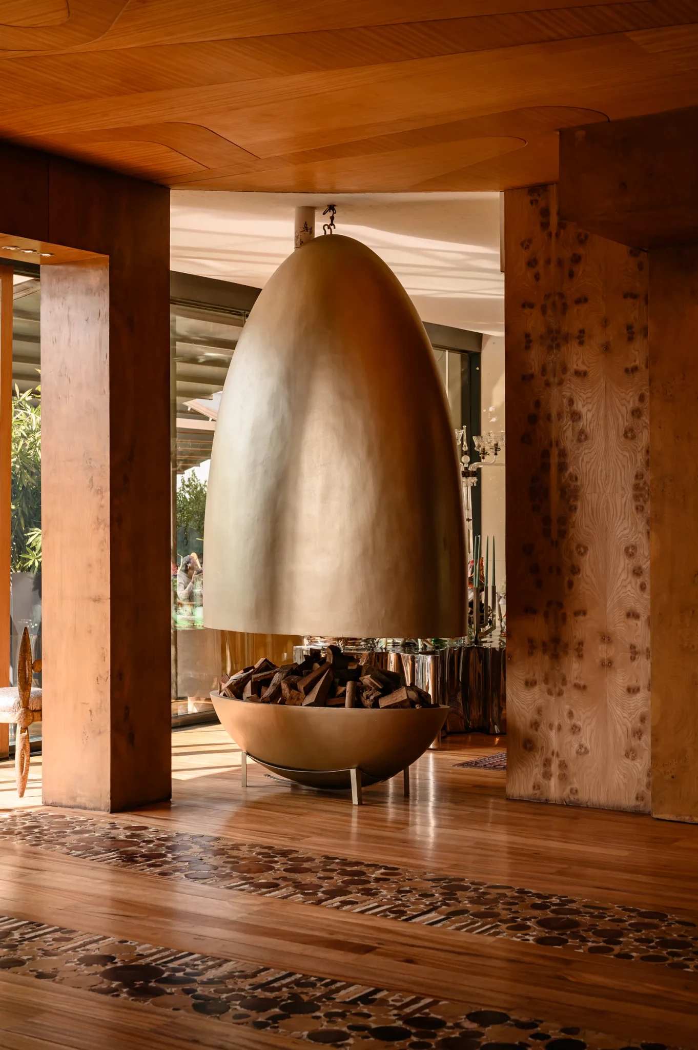 Στο σαλόνι, ένα Murano-γυάλινο γλυπτό του Wael Shawky αιωρείται από την οροφή, ζυγίζοντας σχεδόν 800 κιλά, ενώ σε άλλο δωμάτιο, μια επιβλητική τοιχογραφία από τερακότα, εμπνευσμένη από χαμένο έργο τέχνης, δημιουργήθηκε από τη νεαρή καλλιτέχνιδα Ashgan Makarem. Ένα τζάκι από γαλβανισμένο ατσάλι σε σχήμα αυγού και ένα τεράστιο άνθος από papier-mâché που αγοράστηκε στο Παρίσι συμπληρώνουν τη συλλογή, αποδεικνύοντας πως κάθε στοιχείο του σπιτιού είναι προϊόν δημιουργικής έμπνευσης και προσωπικής αφήγησης.