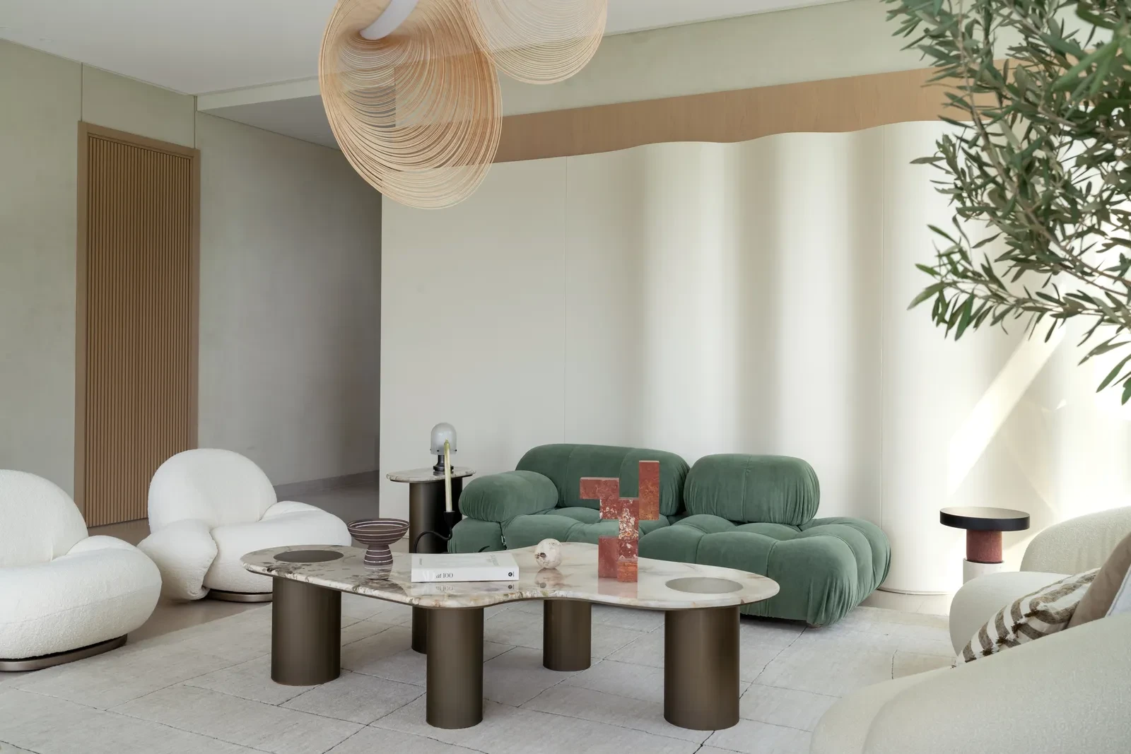 Οι καμπύλες φόρμες, οι πλούσιες υφές και οι διακριτικές χρωματικές πινελιές δημιουργούν ένα περιβάλλον ασφαλές και φιλόξενο για τα παιδιά, ενώ παράλληλα διατηρούν μια αίσθηση ηρεμίας. Πάνω από εξήντα bespoke κατασκευές σχεδιάστηκαν ειδικά για τη βίλα, ανάμεσά τους ένα κυματιστό διαχωριστικό ανάμεσα στο καθιστικό και την τραπεζαρία, που συνδυάζει γλυπτική παρουσία με κρυφούς αποθηκευτικούς χώρους. Το ίδιο πνεύμα συνεχίζεται στην είσοδο, με έναν πάγκο από τραβερτίνη που θέτει τον τόνο από την πρώτη στιγμή, καθώς και στη γεωμετρική σκάλα από δρυ και γυαλί, η οποία λειτουργεί ως σταθερός συνδετικός κρίκος ανάμεσα στους κοινωνικούς χώρους και τα πιο ιδιωτικά υπνοδωμάτια.