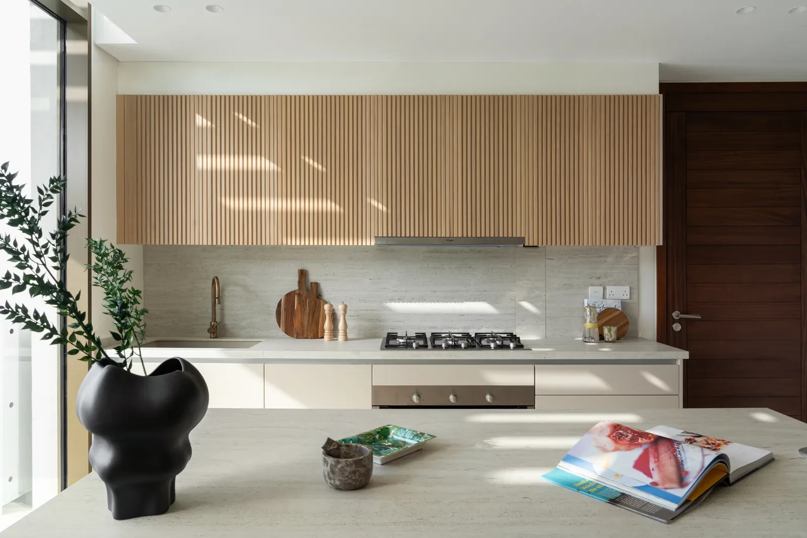Η διαρρύθμιση επανασχεδιάστηκε διακριτικά, ώστε να ανοίξουν οι οπτικές φυγές και να επιτραπεί στο φως να διαχέεται ανεμπόδιστα από χώρο σε χώρο. Η σύνδεση με τον κήπο και τη βεράντα ενισχύθηκε, κάνοντας το εσωτερικό να μοιάζει πιο ευρύχωρο, πιο γαλήνιο, σχεδόν σε συνεχή διάλογο με τις εναλλαγές της ημέρας. Οι ειδικά σχεδιασμένες πόρτες από ξεπλυμένη δρυ και τα ραβδωτά ντουλάπια με χειροποίητη όψη λειτουργούν όχι μόνο πρακτικά, αλλά και ως αρχιτεκτονικά σημεία που καθοδηγούν τη ροή μέσα στο σπίτι.