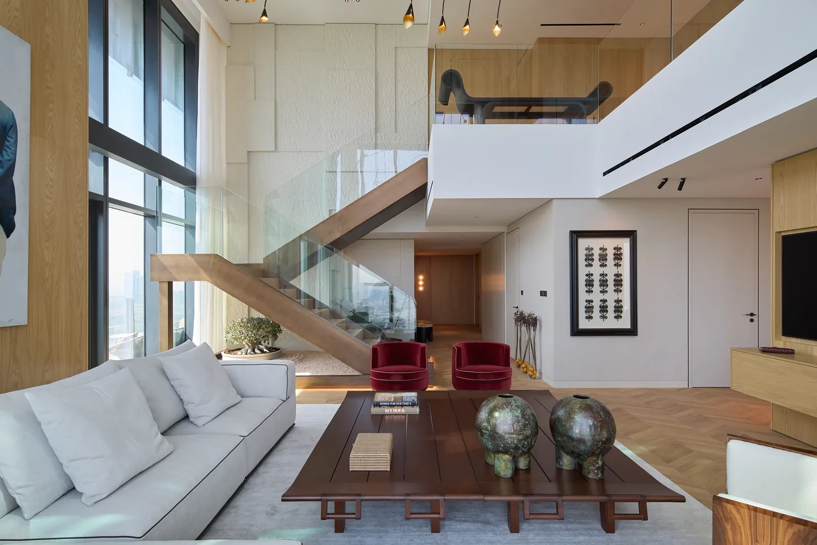 Το σαλόνι διπλού ύψους, με γυάλινους τοίχους, ανοίγει σε πανοραμική θέα προς το Zabeel Park και την πόλη. Το φυσικό φως διεισδύει διακριτικά μέσα από διάφανες κουρτίνες, ενώ τη νύχτα η φωτισμένη πόλη γίνεται ζωντανό φόντο. Ένας ημικυκλικός τοίχος από δρυ διαχωρίζει το καθιστικό από την τραπεζαρία, λειτουργώντας ταυτόχρονα ως κομψή βάση τηλεόρασης. Η σκάλα, κατασκευασμένη από ξύλο, μέταλλο με φινίρισμα μπρούντζου και γυαλί, αποτελεί κεντρικό στοιχείο του χώρου. Δίπλα της, ένας τοίχος με υφή πέτρας ανυψώνεται προς τα πάνω, ενώ ένας μινιμαλιστικός Zen κήπος τοποθετήθηκε κάτω από τη σκάλα, προσθέτοντας μια ήρεμη νότα στη σύνθεση. Το φωτιζόμενο γλυπτό της Danielle Brustman, προσαρμοσμένο στους τόνους του χώρου, προσφέρει μοντέρνα αντίστιξη και δημιουργεί διακριτική εστίαση στο μάτι.